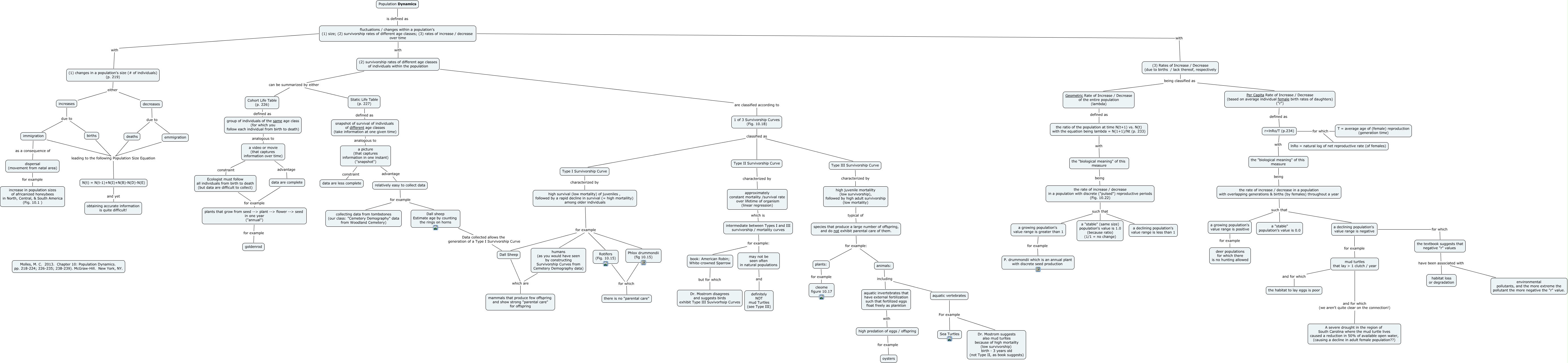This Concept Map, created with IHMC CmapTools, has information related to: Pop Dynamics Ch 10 021815 copy, the rate of increase / decrease in a population with discrete ("pulsed") reproductive periods (Fig. 10.22) such that a declining population's value range is less than 1, emmigration leading to the following Population Size Equation N(t) = N(t-1)+N(I)+N(B)-N(D)-N(E), Static Life Table (p. 227) defined as snapshot of survival of individuals of different age classes (take information at one given time), the rate of increase / decrease in a population with overlapping generations & births (by females) throughout a year such that a growing population's value range is positive, (2) survivorship rates of different age classes of individuals within the population can be summarized by either Cohort Life Table (p. 226), high survival (low mortality) of juveniles , followed by a rapid decline in survival (= high mortalilty) among older individuals for example Dall Sheep, Type I Survivorship Curve characterized by high survival (low mortality) of juveniles , followed by a rapid decline in survival (= high mortalilty) among older individuals, relatively easy to collect data for example Dall sheep Estimate age by counting the rings on horns, high predation of eggs / offspring for example oysters, a video or movie (that captures information over time) constraint Ecologist must follow all individuals from birth to death (but data are difficult to collect), a declining population's value range is negative for example mud turtles that lay > 1 clutch / year, 1 of 3 Survivorship Curves (Fig. 10.18) classified as Type I Survivorship Curve, increases due to immigration, Population Dynamics is defined as fluctuations / changes within a population's (1) size; (2) survivorship rates of different age classes; (3) rates of increase / decrease over time, deaths leading to the following Population Size Equation N(t) = N(t-1)+N(I)+N(B)-N(D)-N(E), snapshot of survival of individuals of different age classes (take information at one given time) analogous to a picture (that captures information in one instant) ("snapshot"), plants that grow from seed --> plant --> flower --> seed in one year ("annual") for example goldenrod, fluctuations / changes within a population's (1) size; (2) survivorship rates of different age classes; (3) rates of increase / decrease over time with (1) changes in a population's size (# of individuals) (p. 219), increases due to births, (1) changes in a population's size (# of individuals) (p. 219) either increases