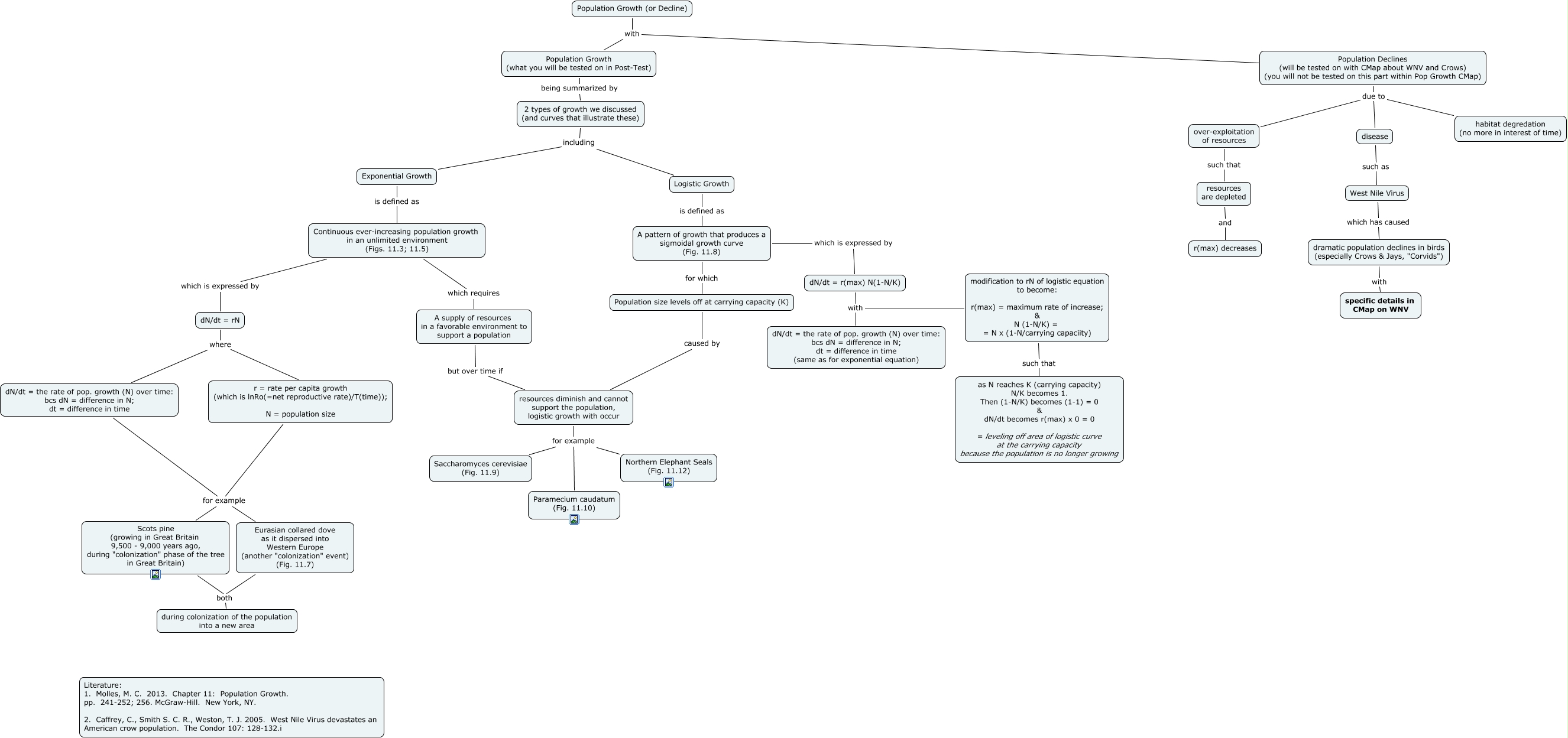 This Concept Map, created with IHMC CmapTools, has information related to: Pop Growth Ch11 021815 copy, resources diminish and cannot support the population, logistic growth with occur for example Northern Elephant Seals (Fig. 11.12), dramatic population declines in birds (especially Crows & Jays, "Corvids") with specific details in CMap on WNV, Population Declines (will be tested on with CMap about WNV and Crows) (you will not be tested on this part within Pop Growth CMap) due to over-exploitation of resources, r = rate per capita growth (which is lnRo(=net reproductive rate)/T(time)); N = population size for example Eurasian collared dove as it dispersed into Western Europe (another "colonization" event) (Fig. 11.7), Population Growth (what you will be tested on in Post-Test) being summarized by 2 types of growth we discussed (and curves that illustrate these), r = rate per capita growth (which is lnRo(=net reproductive rate)/T(time)); N = population size for example Scots pine (growing in Great Britain 9,500 - 9,000 years ago, during "colonization" phase of the tree in Great Britain), Population Declines (will be tested on with CMap about WNV and Crows) (you will not be tested on this part within Pop Growth CMap) due to disease, West Nile Virus which has caused dramatic population declines in birds (especially Crows & Jays, "Corvids"), dN/dt = rN where dN/dt = the rate of pop. growth (N) over time: bcs dN = difference in N; dt = difference in time, Population Growth (or Decline) with Population Growth (what you will be tested on in Post-Test), Population Growth (or Decline) with Population Declines (will be tested on with CMap about WNV and Crows) (you will not be tested on this part within Pop Growth CMap), dN/dt = r(max) N(1-N/K) with dN/dt = the rate of pop. growth (N) over time: bcs dN = difference in N; dt = difference in time (same as for exponential equation), 2 types of growth we discussed (and curves that illustrate these) including Logistic Growth, dN/dt = r(max) N(1-N/K) with modification to rN of logistic equation to become: r(max) = maximum rate of increase; & N (1-N/K) = = N x (1-N/carrying capaciity), dN/dt = the rate of pop. growth (N) over time: bcs dN = difference in N; dt = difference in time for example Scots pine (growing in Great Britain 9,500 - 9,000 years ago, during "colonization" phase of the tree in Great Britain), A pattern of growth that produces a sigmoidal growth curve (Fig. 11.8) for which Population size levels off at carrying capacity (K), Logistic Growth is defined as A pattern of growth that produces a sigmoidal growth curve (Fig. 11.8), 2 types of growth we discussed (and curves that illustrate these) including Exponential Growth, Continuous ever-increasing population growth in an unlimited environment (Figs. 11.3; 11.5) which requires A supply of resources in a favorable environment to support a population, resources are depleted and r(max) decreases