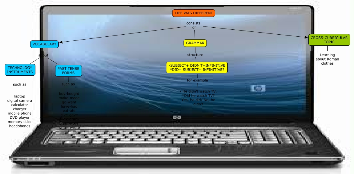 Este Cmap, tiene información relacionada con: LIFE WAS DIFFERENT(Hugo), TECHNOLOGY INSTRUMENTS such as laptop digital camera calculator charger mobile phone DVD player memory stick headphones, VOCABULARY about PAST TENSE FORMS, CROSS-CURRICULAR TOPIC Learning about Roman clothes, LIFE WAS DIFFERENT consists of CROSS-CURRICULAR TOPIC, GRAMMAR structure -SUBJECT+ DIDN'T+INFINITIVE *DID+ SUBJECT+ INFINITIVE?, LIFE WAS DIFFERENT consists of VOCABULARY, -SUBJECT+ DIDN'T+INFINITIVE *DID+ SUBJECT+ INFINITIVE? for example - He didn't watch TV. *Did he watch TV? Yes, he did/ No, he didn't, PAST TENSE FORMS such as buy-bought make-made go-went have-had eat-ate give-gave drink-drank wear-wore write- wrote, LIFE WAS DIFFERENT consists of GRAMMAR, VOCABULARY about TECHNOLOGY INSTRUMENTS