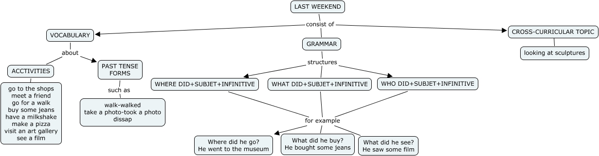 Este Cmap, tiene información relacionada con: LAST WEEKEND(Hilenia), WHAT DID+SUBJET+INFINITIVE for example What did he see? He saw some film, WHERE DID+SUBJET+INFINITIVE for example What did he buy? He bought some jeans, WHO DID+SUBJET+INFINITIVE for example What did he buy? He bought some jeans, GRAMMAR structures WHERE DID+SUBJET+INFINITIVE, LAST WEEKEND consist of CROSS-CURRICULAR TOPIC, GRAMMAR structures WHO DID+SUBJET+INFINITIVE, PAST TENSE FORMS such as walk-walked take a photo-took a photo dissap, WHAT DID+SUBJET+INFINITIVE for example What did he buy? He bought some jeans, WHAT DID+SUBJET+INFINITIVE for example Where did he go? He went to the museum, VOCABULARY about ACCTIVITIES, CROSS-CURRICULAR TOPIC ???? looking at sculptures, ACCTIVITIES such as go to the shops meet a friend go for a walk buy some jeans have a milkshake make a pizza visit an art gallery see a film, WHO DID+SUBJET+INFINITIVE for example Where did he go? He went to the museum, WHO DID+SUBJET+INFINITIVE for example What did he see? He saw some film, WHERE DID+SUBJET+INFINITIVE for example Where did he go? He went to the museum, LAST WEEKEND consist of VOCABULARY, WHERE DID+SUBJET+INFINITIVE for example What did he see? He saw some film, LAST WEEKEND consist of GRAMMAR, GRAMMAR structures WHAT DID+SUBJET+INFINITIVE, VOCABULARY about PAST TENSE FORMS