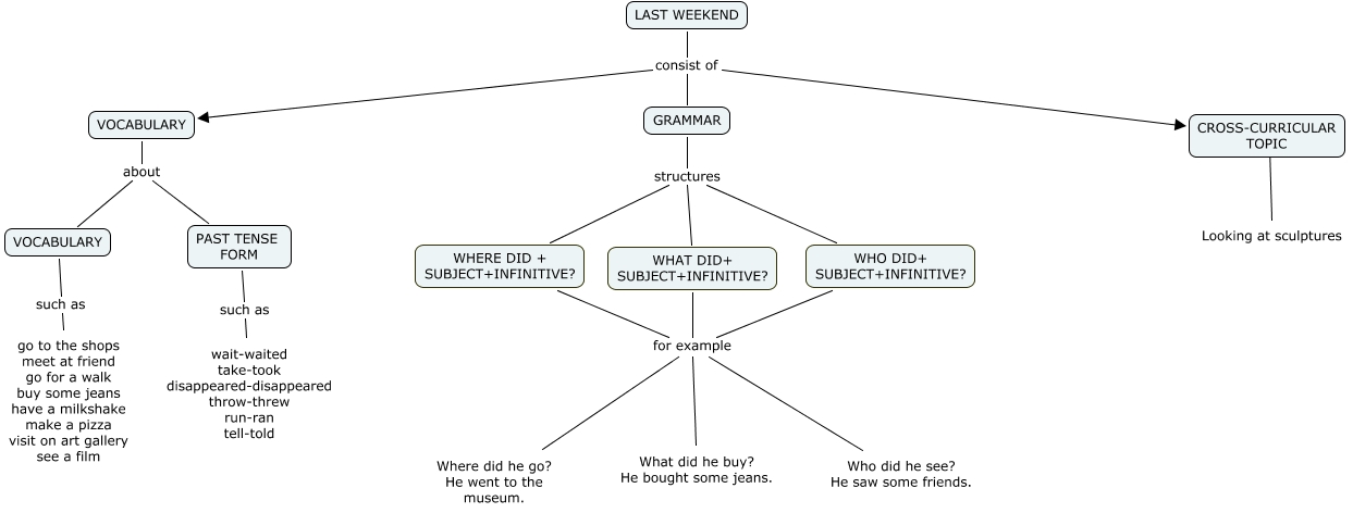 Este Cmap, tiene información relacionada con: LAST WEEKEND(Adrián), WHO DID+ SUBJECT+INFINITIVE? for example Where did he go? He went to the museum., WHAT DID+ SUBJECT+INFINITIVE? for example Who did he see? He saw some friends., GRAMMAR structures WHAT DID+ SUBJECT+INFINITIVE?, GRAMMAR structures WHO DID+ SUBJECT+INFINITIVE?, WHERE DID + SUBJECT+INFINITIVE? for example Where did he go? He went to the museum., WHERE DID + SUBJECT+INFINITIVE? for example Who did he see? He saw some friends., WHAT DID+ SUBJECT+INFINITIVE? for example What did he buy? He bought some jeans., VOCABULARY about VOCABULARY, GRAMMAR structures WHERE DID + SUBJECT+INFINITIVE?, WHERE DID + SUBJECT+INFINITIVE? for example What did he buy? He bought some jeans., CROSS-CURRICULAR TOPIC ???? Looking at sculptures, VOCABULARY such as go to the shops meet at friend go for a walk buy some jeans have a milkshake make a pizza visit on art gallery see a film, LAST WEEKEND consist of GRAMMAR, PAST TENSE FORM such as wait-waited take-took disappeared-disappeared throw-threw run-ran tell-told, LAST WEEKEND consist of CROSS-CURRICULAR TOPIC, WHO DID+ SUBJECT+INFINITIVE? for example What did he buy? He bought some jeans., WHO DID+ SUBJECT+INFINITIVE? for example Who did he see? He saw some friends., LAST WEEKEND consist of VOCABULARY, WHAT DID+ SUBJECT+INFINITIVE? for example Where did he go? He went to the museum., VOCABULARY about PAST TENSE FORM