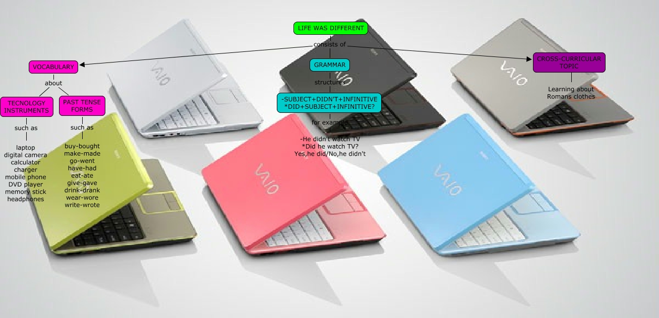 Este Cmap, tiene información relacionada con: LIFE WAS DIFFERENT (Andrea), CROSS-CURRICULAR TOPIC ???? Learning about Romans clothes, GRAMMAR structures -SUBJECT+DIDN'T+INFINITIVE *DID+SUBJECT+INFINITIVE?, VOCABULARY about PAST TENSE FORMS, LIFE WAS DIFFERENT consists of GRAMMAR, VOCABULARY about TECNOLOGY INSTRUMENTS, LIFE WAS DIFFERENT consists of CROSS-CURRICULAR TOPIC, LIFE WAS DIFFERENT consists of VOCABULARY, PAST TENSE FORMS such as buy-bought make-made go-went have-had eat-ate give-gave drink-drank wear-wore write-wrote, -SUBJECT+DIDN'T+INFINITIVE *DID+SUBJECT+INFINITIVE? for example -He didn't watch TV *Did he watch TV? Yes,he did/No,he didn't, TECNOLOGY INSTRUMENTS such as laptop digital camera calculator charger mobile phone DVD player memory stick headphones