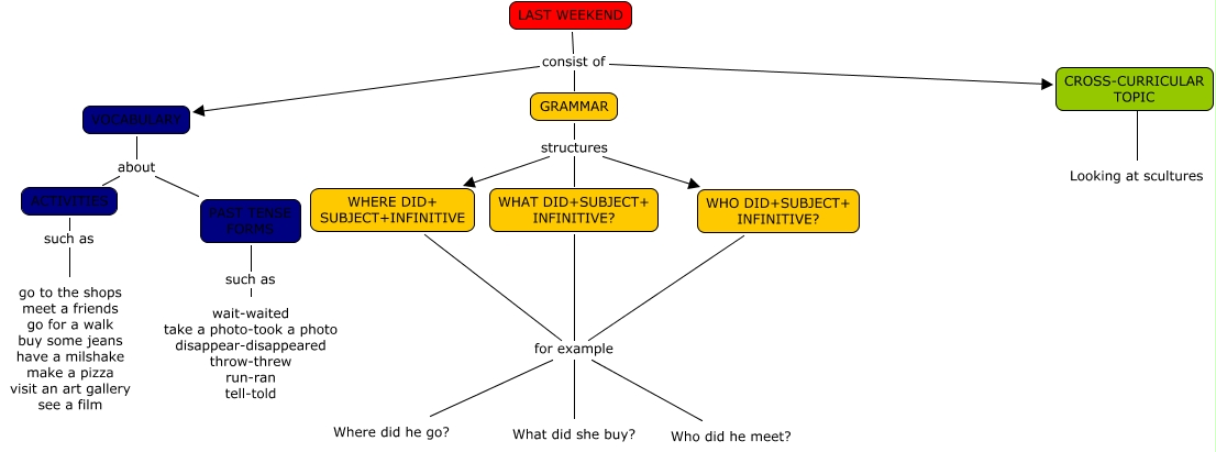 Este Cmap, tiene información relacionada con: LAST WEEKEND(Sofía y Marcos), PAST TENSE FORMS such as wait-waited take a photo-took a photo disappear-disappeared throw-threw run-ran tell-told, GRAMMAR structures WHAT DID+SUBJECT+ INFINITIVE?, WHAT DID+SUBJECT+ INFINITIVE? for example Where did he go?, WHERE DID+ SUBJECT+INFINITIVE for example Where did he go?, GRAMMAR structures WHO DID+SUBJECT+ INFINITIVE?, VOCABULARY about PAST TENSE FORMS, WHO DID+SUBJECT+ INFINITIVE? for example Where did he go?, CROSS-CURRICULAR TOPIC ???? Looking at scultures, VOCABULARY about ACTIVITIES, WHAT DID+SUBJECT+ INFINITIVE? for example What did she buy?, WHAT DID+SUBJECT+ INFINITIVE? for example Who did he meet?, GRAMMAR structures WHERE DID+ SUBJECT+INFINITIVE, ACTIVITIES such as go to the shops meet a friends go for a walk buy some jeans have a milshake make a pizza visit an art gallery see a film, LAST WEEKEND consist of GRAMMAR, LAST WEEKEND consist of CROSS-CURRICULAR TOPIC, LAST WEEKEND consist of VOCABULARY, WHO DID+SUBJECT+ INFINITIVE? for example What did she buy?, WHERE DID+ SUBJECT+INFINITIVE for example Who did he meet?, WHO DID+SUBJECT+ INFINITIVE? for example Who did he meet?, WHERE DID+ SUBJECT+INFINITIVE for example What did she buy?