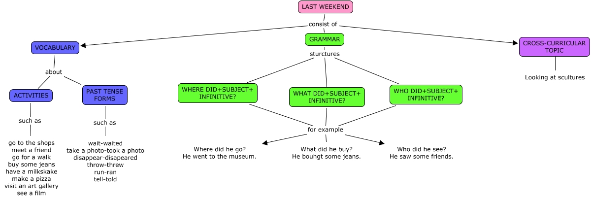 Este Cmap, tiene información relacionada con: LAST WEEKEND(Manuela), PAST TENSE FORMS such as wait-waited take a photo-took a photo disappear-disapeared throw-threw run-ran tell-told, WHERE DID+SUBJECT+ INFINITIVE? for example Where did he go? He went to the museum., VOCABULARY about PAST TENSE FORMS, VOCABULARY about ACTIVITIES, LAST WEEKEND consist of GRAMMAR, GRAMMAR sturctures WHERE DID+SUBJECT+ INFINITIVE?, GRAMMAR sturctures WHAT DID+SUBJECT+ INFINITIVE?, LAST WEEKEND consist of CROSS-CURRICULAR TOPIC, WHAT DID+SUBJECT+ INFINITIVE? for example Where did he go? He went to the museum., WHO DID+SUBJECT+ INFINITIVE? for example What did he buy? He bouhgt some jeans., WHAT DID+SUBJECT+ INFINITIVE? for example Who did he see? He saw some friends., WHAT DID+SUBJECT+ INFINITIVE? for example What did he buy? He bouhgt some jeans., WHERE DID+SUBJECT+ INFINITIVE? for example Who did he see? He saw some friends., ACTIVITIES such as go to the shops meet a friend go for a walk buy some jeans have a milkskake make a pizza visit an art gallery see a film, WHERE DID+SUBJECT+ INFINITIVE? for example What did he buy? He bouhgt some jeans., GRAMMAR sturctures WHO DID+SUBJECT+ INFINITIVE?, LAST WEEKEND consist of VOCABULARY, CROSS-CURRICULAR TOPIC ???? Looking at scultures, WHO DID+SUBJECT+ INFINITIVE? for example Who did he see? He saw some friends., WHO DID+SUBJECT+ INFINITIVE? for example Where did he go? He went to the museum.