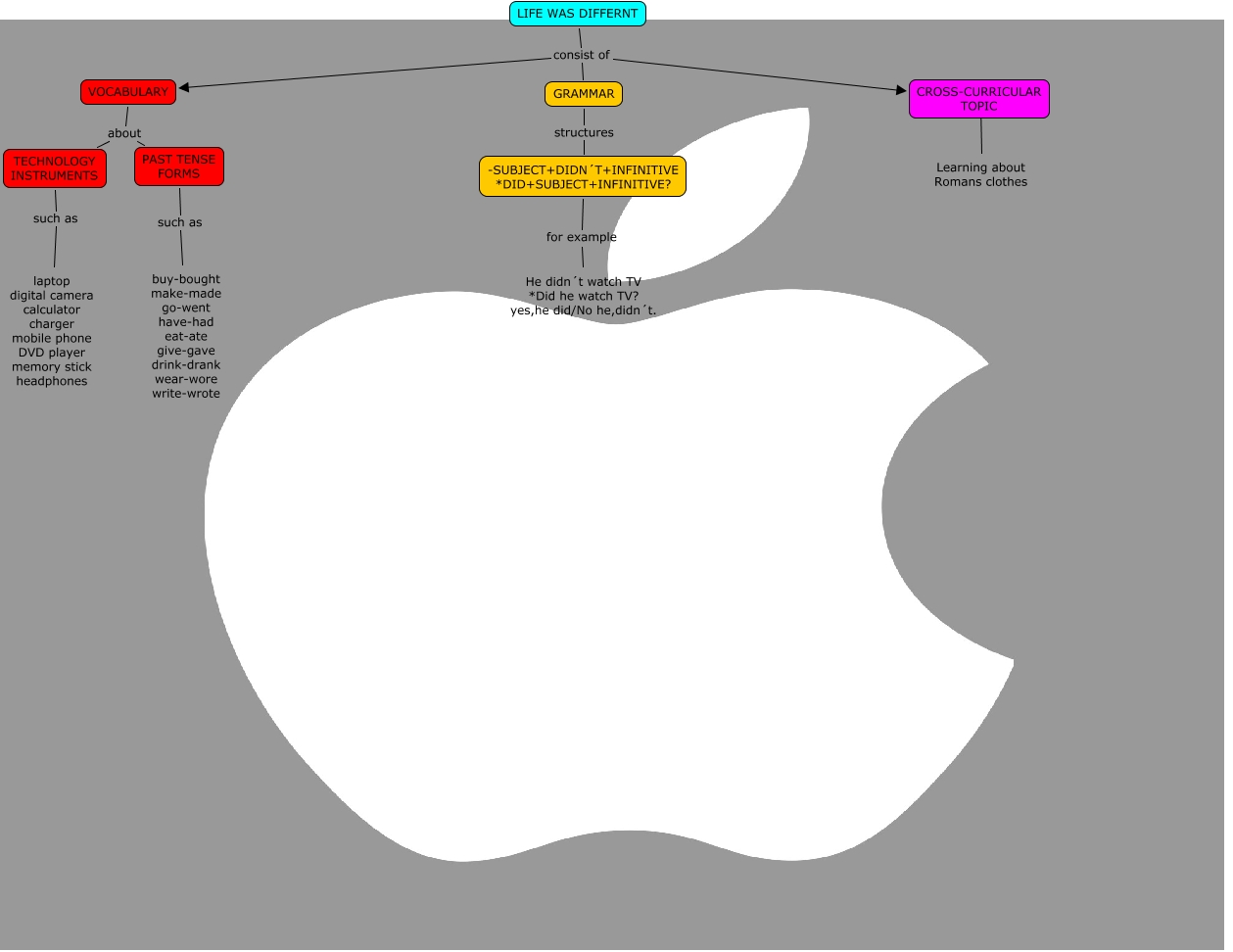 Este Cmap, tiene información relacionada con: LIFE WAS DIFFERENT(Manuel), LIFE WAS DIFFERNT consist of CROSS-CURRICULAR TOPIC, GRAMMAR structures -SUBJECT+DIDN´T+INFINITIVE *DID+SUBJECT+INFINITIVE?, LIFE WAS DIFFERNT consist of GRAMMAR, LIFE WAS DIFFERNT consist of VOCABULARY, VOCABULARY about TECHNOLOGY INSTRUMENTS, -SUBJECT+DIDN´T+INFINITIVE *DID+SUBJECT+INFINITIVE? for example He didn´t watch TV *Did he watch TV? yes,he did/No he,didn´t., PAST TENSE FORMS such as buy-bought make-made go-went have-had eat-ate give-gave drink-drank wear-wore write-wrote, TECHNOLOGY INSTRUMENTS such as laptop digital camera calculator charger mobile phone DVD player memory stick headphones, CROSS-CURRICULAR TOPIC ???? Learning about Romans clothes, VOCABULARY about PAST TENSE FORMS