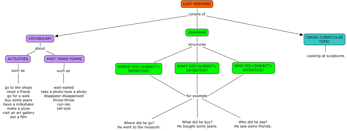 Este Cmap, tiene información relacionada con: LAST WEEKEND (Irene), Looking at sculptures ???? CROSS-CURRICULAR TOPIC, LAST WEEKEND consits of GRAMMAR, PAST TENSE FORMS such as wait-waited take a photo-took a photo disappear-disapperaed throw-threw run-ran tell-told, WHO DID+SUBJECT+ INFINITIVE? for example Where did he go? He went to the museum., WHAT DID+SUBJECT+ INFINITIVE? for example Who did he see? He saw some friends., LAST WEEKEND consits of CROSS-CURRICULAR TOPIC, WHERE DID+SUBJECT+ INFINITIVE? for example Where did he go? He went to the museum., WHO DID+SUBJECT+ INFINITIVE? for example Who did he see? He saw some friends., WHO DID+SUBJECT+ INFINITIVE? for example What did he buy? He bought some jeans., WHAT DID+SUBJECT+ INFINITIVE? for example Where did he go? He went to the museum., GRAMMAR structures WHERE DID+SUBJECT+ INFINITIVE?, WHERE DID+SUBJECT+ INFINITIVE? for example Who did he see? He saw some friends., GRAMMAR structures WHAT DID+SUBJECT+ INFINITIVE?, WHAT DID+SUBJECT+ INFINITIVE? for example What did he buy? He bought some jeans., VOCABULARY about ACTIVITIES, WHERE DID+SUBJECT+ INFINITIVE? for example What did he buy? He bought some jeans., LAST WEEKEND consits of VOCABULARY, GRAMMAR structures WHO DID+SUBJECT+ INFINITIVE?, VOCABULARY about PAST TENSE FORMS, ACTIVITIES such as go to the shops meet a friend go for a walk buy some jeans have a milkshake make a pizza visit an art gallery see a film