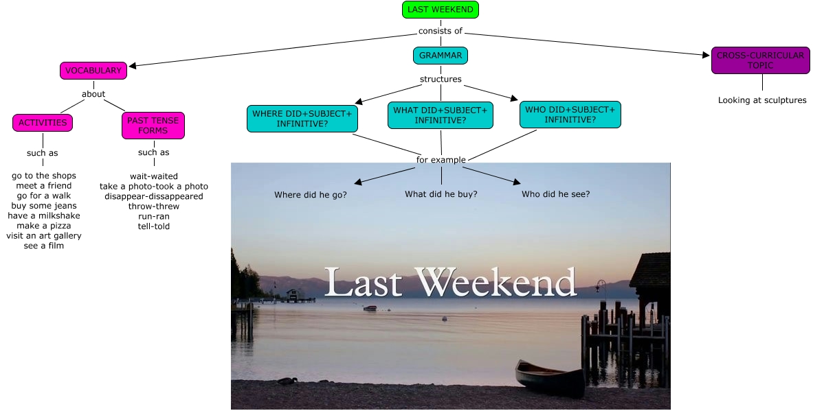 Este Cmap, tiene información relacionada con: LAST WEEKEND (Andrea), WHO DID+SUBJECT+ INFINITIVE? for example What did he buy?, WHO DID+SUBJECT+ INFINITIVE? for example Who did he see?, WHAT DID+SUBJECT+ INFINITIVE? for example What did he buy?, WHERE DID+SUBJECT+ INFINITIVE? for example Who did he see?, PAST TENSE FORMS such as wait-waited take a photo-took a photo disappear-dissappeared throw-threw run-ran tell-told, LAST WEEKEND consists of CROSS-CURRICULAR TOPIC, VOCABULARY about PAST TENSE FORMS, GRAMMAR structures WHO DID+SUBJECT+ INFINITIVE?, WHAT DID+SUBJECT+ INFINITIVE? for example Where did he go?, CROSS-CURRICULAR TOPIC ???? Looking at sculptures, WHERE DID+SUBJECT+ INFINITIVE? for example What did he buy?, GRAMMAR structures WHAT DID+SUBJECT+ INFINITIVE?, WHERE DID+SUBJECT+ INFINITIVE? for example Where did he go?, ACTIVITIES such as go to the shops meet a friend go for a walk buy some jeans have a milkshake make a pizza visit an art gallery see a film, LAST WEEKEND consists of GRAMMAR, WHAT DID+SUBJECT+ INFINITIVE? for example Who did he see?, VOCABULARY about ACTIVITIES, LAST WEEKEND consists of VOCABULARY, WHO DID+SUBJECT+ INFINITIVE? for example Where did he go?, GRAMMAR structures WHERE DID+SUBJECT+ INFINITIVE?