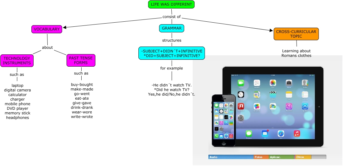 Este Cmap, tiene información relacionada con: LIFE WAS DIFFERENT(Sergio), PAST TENSE FORMS such as buy-bought make-made go-went eat-ate give-gave drink-drank wear-wore write-wrote, LIFE WAS DIFFERENT consist of GRAMMAR, GRAMMAR structures -SUBJECT+DIDN´T+INFINITIVE *DID+SUBJECT+INFINITIVE?, CROSS-CURRICULAR TOPIC ???? Learning about Romans clothes, -SUBJECT+DIDN´T+INFINITIVE *DID+SUBJECT+INFINITIVE? for example -He didn´t watch TV. *Did he watch TV? Yes,he did/No,he didn´t., TECHNOLOGY INSTRUMENTS such as laptop digital camera calculator charger mobile phone DVD player memory stick headphones, LIFE WAS DIFFERENT consist of VOCABULARY, VOCABULARY about TECHNOLOGY INSTRUMENTS, LIFE WAS DIFFERENT consist of CROSS-CURRICULAR TOPIC, VOCABULARY about PAST TENSE FORMS