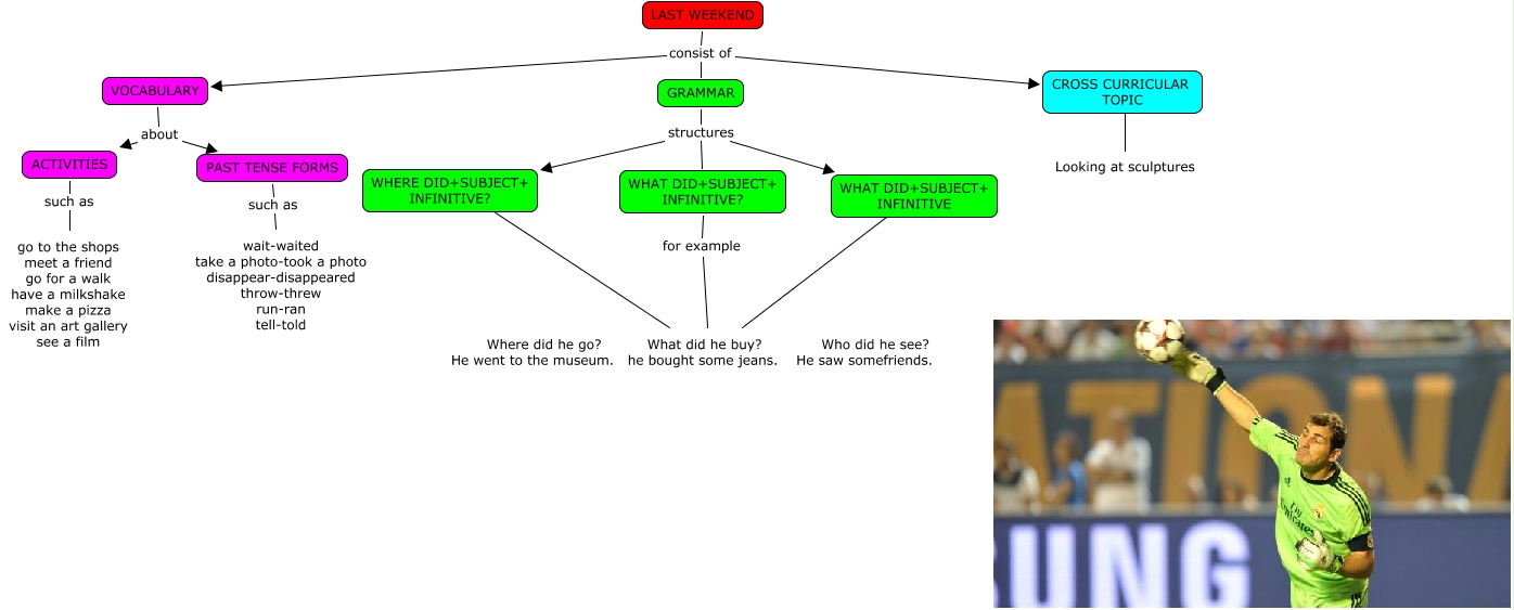Este Cmap, tiene información relacionada con: LAST WEEKEND(Sergio), WHERE DID+SUBJECT+ INFINITIVE? ???? Where did he go? What did he buy? Who did he see? He went to the museum. he bought some jeans. He saw somefriends., WHAT DID+SUBJECT+ INFINITIVE? for example Where did he go? What did he buy? Who did he see? He went to the museum. he bought some jeans. He saw somefriends., GRAMMAR structures WHERE DID+SUBJECT+ INFINITIVE?, LAST WEEKEND consist of VOCABULARY, ACTIVITIES such as go to the shops meet a friend go for a walk have a milkshake make a pizza visit an art gallery see a film, CROSS CURRICULAR TOPIC ???? Looking at sculptures, LAST WEEKEND consist of CROSS CURRICULAR TOPIC, GRAMMAR structures WHAT DID+SUBJECT+ INFINITIVE?, PAST TENSE FORMS such as wait-waited take a photo-took a photo disappear-disappeared throw-threw run-ran tell-told, WHAT DID+SUBJECT+ INFINITIVE ???? Where did he go? What did he buy? Who did he see? He went to the museum. he bought some jeans. He saw somefriends., LAST WEEKEND consist of GRAMMAR, GRAMMAR structures WHAT DID+SUBJECT+ INFINITIVE, VOCABULARY about ACTIVITIES, VOCABULARY about PAST TENSE FORMS