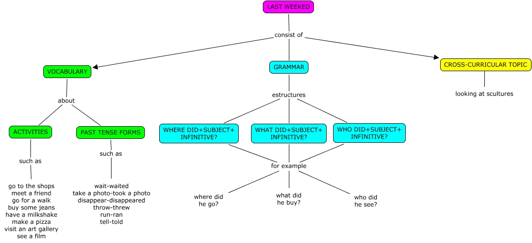 Este Cmap, tiene información relacionada con: LAST WEEKEND(Marta), WHO DID+SUBJECT+ INFINITIVE? for example where did he go?, PAST TENSE FORMS such as wait-waited take a photo-took a photo disappear-disappeared throw-threw run-ran tell-told, WHAT DID+SUBJECT+ INFINITIVE? for example who did he see?, ACTIVITIES such as go to the shops meet a friend go for a walk buy some jeans have a milkshake make a pizza visit an art gallery see a film, WHERE DID+SUBJECT+ INFINITIVE? for example what did he buy?, WHAT DID+SUBJECT+ INFINITIVE? for example where did he go?, WHERE DID+SUBJECT+ INFINITIVE? for example who did he see?, LAST WEEKED consist of VOCABULARY, CROSS-CURRICULAR TOPIC ???? looking at scultures, VOCABULARY about PAST TENSE FORMS, VOCABULARY about ACTIVITIES, WHERE DID+SUBJECT+ INFINITIVE? for example where did he go?, GRAMMAR estructures WHAT DID+SUBJECT+ INFINITIVE?, WHO DID+SUBJECT+ INFINITIVE? for example who did he see?, LAST WEEKED consist of GRAMMAR, WHO DID+SUBJECT+ INFINITIVE? for example what did he buy?, WHAT DID+SUBJECT+ INFINITIVE? for example what did he buy?, GRAMMAR estructures WHO DID+SUBJECT+ INFINITIVE?, LAST WEEKED consist of CROSS-CURRICULAR TOPIC, GRAMMAR estructures WHERE DID+SUBJECT+ INFINITIVE?