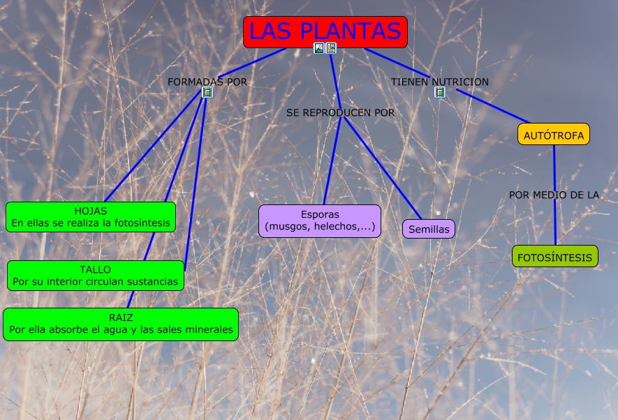 Este Cmap, tiene información relacionada con: Las plantas 2, LAS PLANTAS SE REPRODUCEN POR Esporas (musgos, helechos,...), AUTÓTROFA POR MEDIO DE LA FOTOSÍNTESIS, LAS PLANTAS FORMADAS POR RAIZ Por ella absorbe el agua y las sales minerales, LAS PLANTAS FORMADAS POR HOJAS En ellas se realiza la fotosíntesis, LAS PLANTAS FORMADAS POR TALLO Por su interior circulan sustancias, LAS PLANTAS TIENEN NUTRICION AUTÓTROFA, LAS PLANTAS SE REPRODUCEN POR Semillas