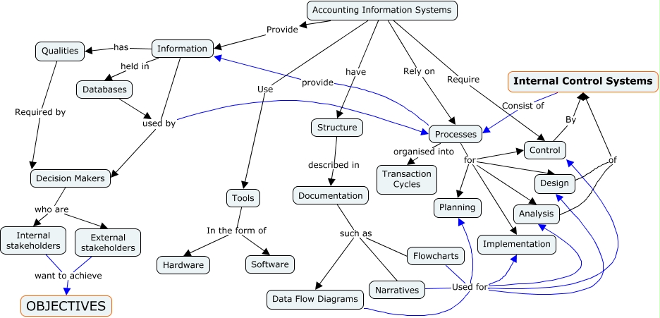 This Concept Map, created with IHMC CmapTools, has information related to: AIS_Concept, Accounting Information Systems Require Control, Narratives Used for Analysis, Databases used by Decision Makers, Accounting Information Systems Rely on Processes, Structure described in Documentation, Control By Internal Control Systems, Processes organised into Transaction Cycles, Information used by Decision Makers, Processes for Planning, Internal Control Systems Consist of Processes, Analysis of Internal Control Systems, Flowcharts Used for Analysis, Processes for Implementation, Accounting Information Systems have Structure, Accounting Information Systems Provide Information, Processes for Design, Documentation such as Data Flow Diagrams, Flowcharts Used for Implementation, Flowcharts Used for Planning, Accounting Information Systems Use Tools