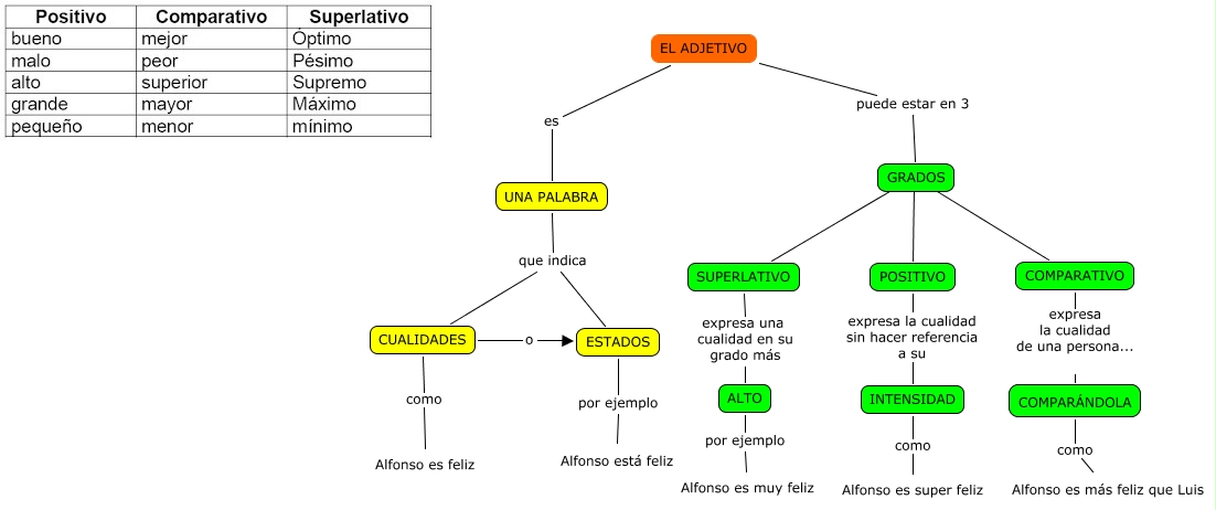 Este Cmap, tiene información relacionada con: El adjetivo-Alfonso, CUALIDADES como Alfonso es feliz, GRADOS ???? SUPERLATIVO, GRADOS ???? POSITIVO, ALTO por ejemplo Alfonso es muy feliz, UNA PALABRA que indica ESTADOS, COMPARÁNDOLA como Alfonso es más feliz que Luis, ESTADOS por ejemplo Alfonso está feliz, EL ADJETIVO puede estar en 3 GRADOS, UNA PALABRA que indica CUALIDADES, POSITIVO expresa la cualidad sin hacer referencia a su INTENSIDAD, SUPERLATIVO expresa una cualidad en su grado más ALTO, EL ADJETIVO es UNA PALABRA, GRADOS ???? COMPARATIVO, INTENSIDAD como Alfonso es super feliz, COMPARATIVO expresa la cualidad de una persona... COMPARÁNDOLA, CUALIDADES o ESTADOS