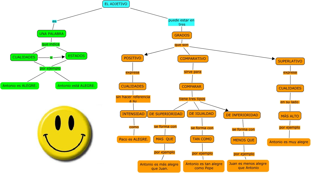 Este Cmap, tiene información relacionada con: EL ADJETIVO-Joaquín, EL ADJETIVO es UNA PALABRA, COMPARAR tiene tres tipos DE SUPERIORIDAD, ESTADOS por ejemplo Antonio es ALEGRE., SUPERLATIVO expresa CUALIDADES, EL ADJETIVO puede estar en tres GRADOS, CUALIDADES por ejemplo Antonio es ALEGRE., TAN COMO por ejemplo Antonio es tan alegre como Pepe, DE IGUALDAD se forma con TAN COMO, COMPARAR tiene tres tipos DE IGUALDAD, POSITIVO expresa CUALIDADES, MÁS ALTO por ejemplo Antonio es muy alegre, ESTADOS por ejemplo Antonio está ALEGRE., CUALIDADES por ejemplo Antonio está ALEGRE., CUALIDADES en su lado MÁS ALTO, GRADOS que son COMPARATIVO, COMPARATIVO sirve para COMPARAR, UNA PALABRA que indica CUALIDADES, MAS QUE por ejemplo Antonio es más alegre que Juan., DE INFERIORIDAD se forma con MENOS QUE, CUALIDADES sin hacer referencia a su INTENSIDAD