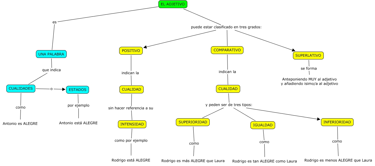 Este Cmap, tiene información relacionada con: EL ADJETIVO-Rodrigo, CUALIDAD y peden ser de tres tipos: SUPERIORIDAD, IGUALDAD como Rodrigo es tan ALEGRE como Laura, CUALIDAD sin hacer referencia a su INTENSIDAD, CUALIDAD y peden ser de tres tipos: INFERIORIDAD, ESTADOS por ejemplo Antonio está ALEGRE, INFERIORIDAD como Rodrigo es menos ALEGRE que Laura, EL ADJETIVO puede estar clasificado en tres grados: COMPARATIVO, CUALIDADES como Antonio es ALEGRE, POSITIVO indican la CUALIDAD, CUALIDADES o ESTADOS, UNA PALABRA que indica CUALIDADES, EL ADJETIVO es UNA PALABRA, INTENSIDAD como por ejemplo Rodrigo está ALEGRE, SUPERLATIVO se forma Anteponiendo MUY al adjetivo y añadiendo isimo/a al adjetivo, COMPARATIVO indican la CUALIDAD, CUALIDAD y peden ser de tres tipos: IGUALDAD, SUPERIORIDAD como Rodrigo es más ALEGRE que Laura, EL ADJETIVO puede estar clasificado en tres grados: SUPERLATIVO, EL ADJETIVO puede estar clasificado en tres grados: POSITIVO