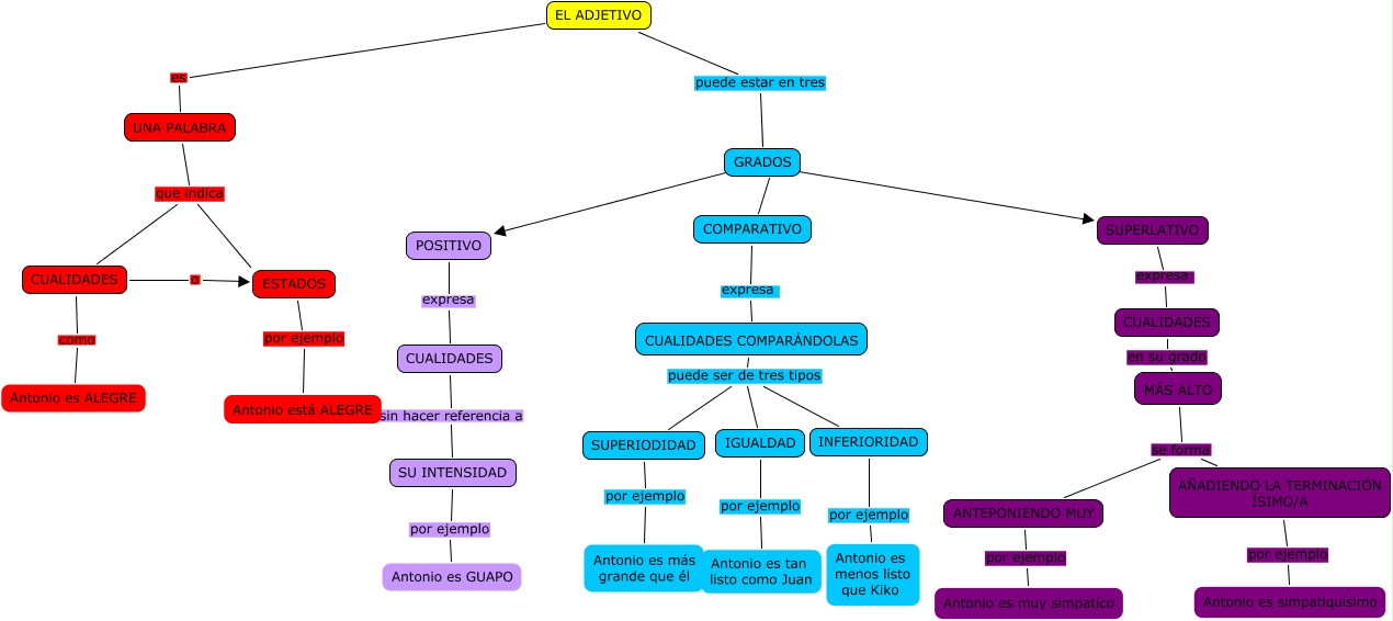 Este Cmap, tiene información relacionada con: EL ADJETIVO-Pablo, ESTADOS por ejemplo Antonio está ALEGRE, SUPERIODIDAD por ejemplo Antonio es más grande que él, GRADOS ???? POSITIVO, AÑADIENDO LA TERMINACIÓN ÍSIMO/A por ejemplo Antonio es simpatiquísimo, GRADOS ???? SUPERLATIVO, CUALIDADES en su grado MÁS ALTO, CUALIDADES COMPARÁNDOLAS puede ser de tres tipos IGUALDAD, CUALIDADES sin hacer referencia a SU INTENSIDAD, GRADOS ???? COMPARATIVO, CUALIDADES COMPARÁNDOLAS puede ser de tres tipos INFERIORIDAD, MÁS ALTO se forma AÑADIENDO LA TERMINACIÓN ÍSIMO/A, SUPERLATIVO expresa CUALIDADES, ANTEPONIENDO MUY por ejemplo Antonio es muy simpatíco, EL ADJETIVO puede estar en tres GRADOS, CUALIDADES o ESTADOS, SU INTENSIDAD por ejemplo Antonio es GUAPO, UNA PALABRA que indica ESTADOS, EL ADJETIVO es UNA PALABRA, INFERIORIDAD por ejemplo Antonio es menos listo que Kiko, POSITIVO expresa CUALIDADES