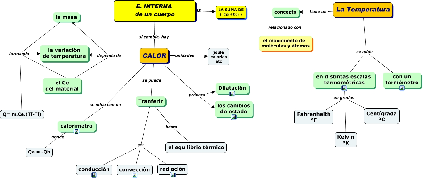 Este Cmap, tiene información relacionada con: Calor y temperatura, La Temperatura se mide con un termómetro, la masa formando el Ce del material, CALOR provoca Dilatación, CALOR unidades joule calorias etc, E. INTERNA de un cuerpo si cambia, hay CALOR, calorímetro donde Qa = -Qb, CALOR provoca los cambios de estado, CALOR se puede Tranferir, Tranferir por conducción, CALOR depende de la masa, E. INTERNA de un cuerpo ES LA SUMA DE ( Epi+Eci ), Tranferir por radiación, en distintas escalas termométricas en grados Fahrenheith ºF, en distintas escalas termométricas en grados Centígrada ºC, CALOR depende de la variación de temperatura, CALOR depende de el Ce del material, Tranferir por convección, Tranferir hasta el equilibrio térmico, CALOR se mide con un calorímetro, La Temperatura se mide en distintas escalas termométricas