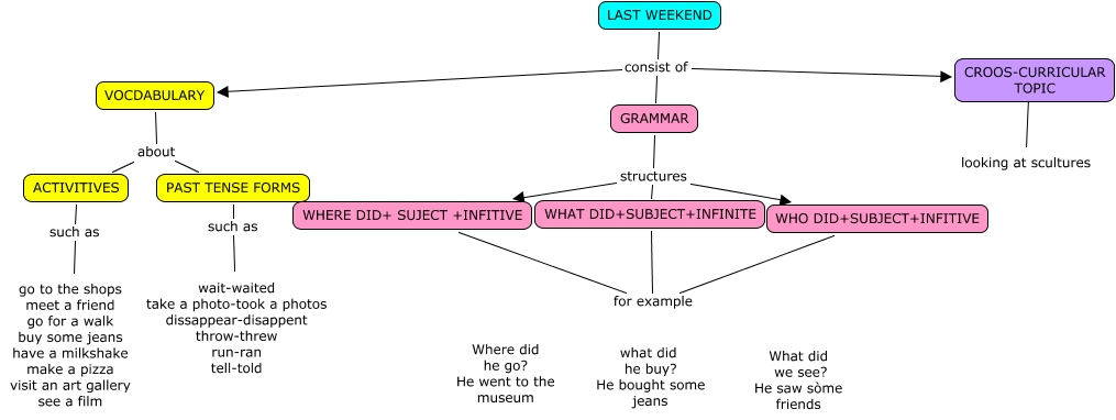 Este Cmap, tiene información relacionada con: LAST WEEKEND(Paula), GRAMMAR structures WHERE DID+ SUJECT +INFITIVE, LAST WEEKEND consist of GRAMMAR, WHAT DID+SUBJECT+INFINITE for example what did he buy? He bought some jeans, WHERE DID+ SUJECT +INFITIVE for example What did we see? He saw sòme friends, WHAT DID+SUBJECT+INFINITE for example What did we see? He saw sòme friends, WHAT DID+SUBJECT+INFINITE for example Where did he go? He went to the museum, LAST WEEKEND consist of CROOS-CURRICULAR TOPIC, WHO DID+SUBJECT+INFITIVE for example Where did he go? He went to the museum, GRAMMAR structures WHO DID+SUBJECT+INFITIVE, WHERE DID+ SUJECT +INFITIVE for example what did he buy? He bought some jeans, ACTIVITIVES such as go to the shops meet a friend go for a walk buy some jeans have a milkshake make a pizza visit an art gallery see a film, WHERE DID+ SUJECT +INFITIVE for example Where did he go? He went to the museum, GRAMMAR structures WHAT DID+SUBJECT+INFINITE, VOCDABULARY about PAST TENSE FORMS, WHO DID+SUBJECT+INFITIVE for example what did he buy? He bought some jeans, VOCDABULARY about ACTIVITIVES, PAST TENSE FORMS such as wait-waited take a photo-took a photos dissappear-disappent throw-threw run-ran tell-told, CROOS-CURRICULAR TOPIC ???? looking at scultures, WHO DID+SUBJECT+INFITIVE for example What did we see? He saw sòme friends, LAST WEEKEND consist of VOCDABULARY