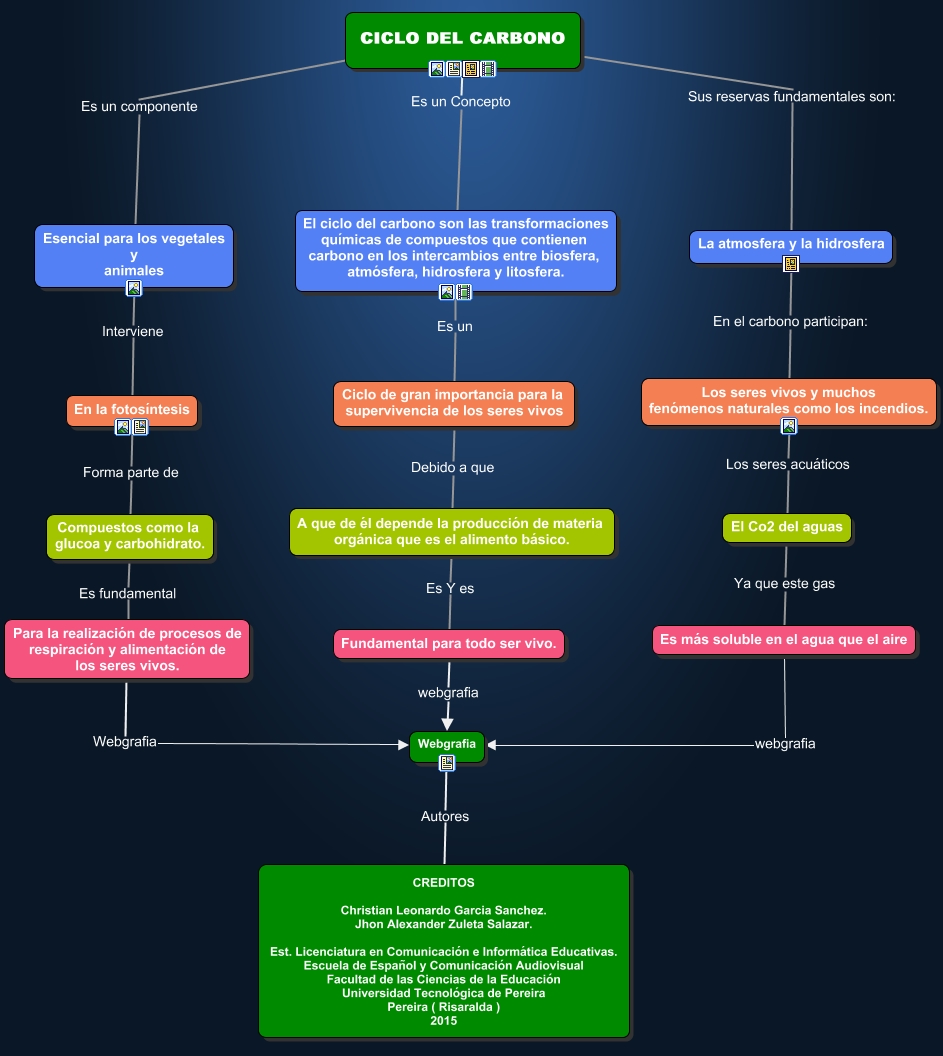 Este Cmap, tiene información relacionada con: Ciclo_Carbono, A que de él depende la producción de materia orgánica que es el alimento básico. Es Y es Fundamental para todo ser vivo., En la fotosíntesis Forma parte de Compuestos como la glucoa y carbohidrato., Compuestos como la glucoa y carbohidrato. Es fundamental Para la realización de procesos de respiración y alimentación de los seres vivos., Webgrafia Autores CREDITOS Christian Leonardo Garcia Sanchez. Jhon Alexander Zuleta Salazar. Est. Licenciatura en Comunicación e Informática Educativas. Escuela de Español y Comunicación Audiovisual Facultad de las Ciencias de la Educación Universidad Tecnológica de Pereira Pereira ( Risaralda ) 2015, La atmosfera y la hidrosfera En el carbono participan: Los seres vivos y muchos fenómenos naturales como los incendios., Para la realización de procesos de respiración y alimentación de los seres vivos. Webgrafia Webgrafia, Es más soluble en el agua que el aire webgrafia Webgrafia, CICLO DEL CARBONO Es un Concepto El ciclo del carbono son las transformaciones químicas de compuestos que contienen carbono en los intercambios entre biosfera, atmósfera, hidrosfera y litosfera., El Co2 del aguas Ya que este gas Es más soluble en el agua que el aire, Fundamental para todo ser vivo. webgrafia Webgrafia, Esencial para los vegetales y animales Interviene En la fotosíntesis, CICLO DEL CARBONO Sus reservas fundamentales son: La atmosfera y la hidrosfera, CICLO DEL CARBONO Es un componente Esencial para los vegetales y animales, Los seres vivos y muchos fenómenos naturales como los incendios. Los seres acuáticos El Co2 del aguas, Ciclo de gran importancia para la supervivencia de los seres vivos Debido a que A que de él depende la producción de materia orgánica que es el alimento básico., El ciclo del carbono son las transformaciones químicas de compuestos que contienen carbono en los intercambios entre biosfera, atmósfera, hidrosfera y litosfera. Es un Ciclo de gran importancia para la supervivencia de los seres vivos