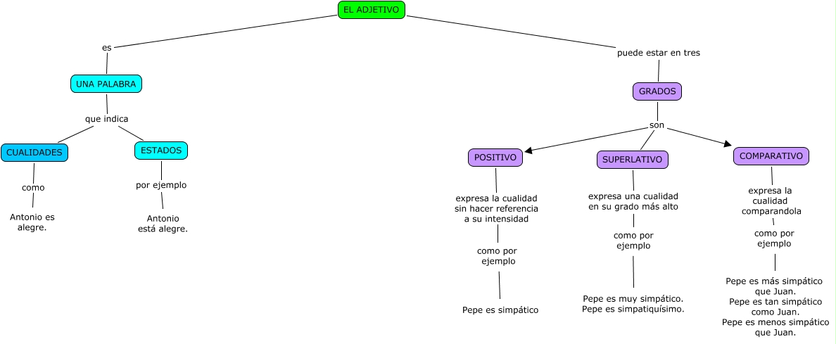 Este Cmap, tiene información relacionada con: EL ADJETIVO-(Iria), ESTADOS por ejemplo Antonio está alegre., EL ADJETIVO es UNA PALABRA, GRADOS son SUPERLATIVO, UNA PALABRA que indica CUALIDADES, como por ejemplo ???? Pepe es simpático, EL ADJETIVO puede estar en tres GRADOS, como por ejemplo ???? Pepe es muy simpático. Pepe es simpatiquísimo., GRADOS son COMPARATIVO, UNA PALABRA que indica ESTADOS, GRADOS son POSITIVO, como por ejemplo ???? Pepe es más simpático que Juan. Pepe es tan simpático como Juan. Pepe es menos simpático que Juan., COMPARATIVO expresa la cualidad comparandola como por ejemplo, SUPERLATIVO expresa una cualidad en su grado más alto como por ejemplo, CUALIDADES como Antonio es alegre., POSITIVO expresa la cualidad sin hacer referencia a su intensidad como por ejemplo