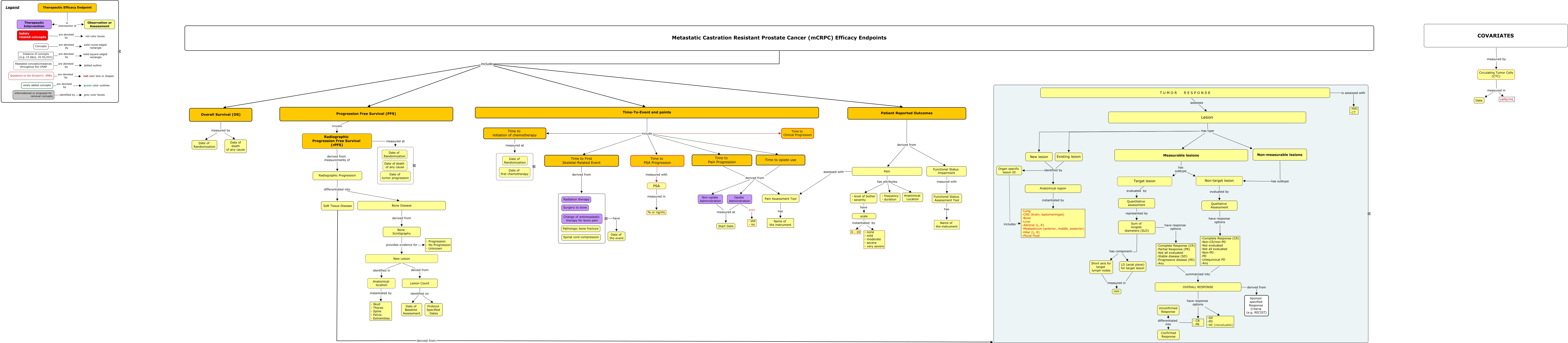 This Concept Map, created with IHMC CmapTools, has information related to: Prostate Cancer Efficacy Endpoints_v4, Anatomical region instantiated by -Lung -CNS (brain, leptomeninges) -Bone -Liver -Adrenal (L, R) -Mediastinum (anterior, middle, posterior) -Hilar (L, R) -Plural Fluid, New Lesion identified in Anatomical location, Non-opiate Administration measured at Start Date, Target lesion evaluated by Quantitative assessment, - CR - PR differentiated into Confirmed Response, Time-To-Event end points include Time to initiation of chemotherapy, Sum of longest diameters (SLD) has component LD (axial plane) for target lesion, Functional Status Impairment masured with Functional Status Assessment Tool, OVERALL RESPONSE derived from Sponsor specified Response Criteria (e.g. RECIST), T U M O R R E S P O N S E is assessed with -MRI -CT, -Complete Response (CR) -Non-CR/non-PD -Not evaluated -Not all evaluated -Non-PD -PD -Unequivocal PD -Any summarized into OVERALL RESPONSE, Progression Free Survival (PFS) includes Radiographic Progression Free Survival (rPFS), OVERALL RESPONSE have response options -SD -PD -NE (inevaluable), New lesion identified by Organ specific lesion ID, Non-target lesion evaluated by Qualitative Assessment, Circulating Tumor Cells (CTC) measured in Date, Time to opiate use derived from Opiate Administration, -Complete Response (CR) -Partial Response (PR) -Not all evaluated -Stable disease (SD) -Progressive disease (PD) -Any summarized into OVERALL RESPONSE, Patient Reported Outcomes derived from Functional Status Impairment, LD (axial plane) for target lesion measured in mm