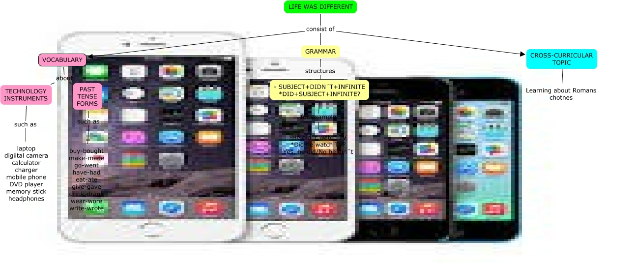Este Cmap, tiene información relacionada con: LIFE WAS DIFFERENT (Paula), CROSS-CURRICULAR TOPIC ???? Learning about Romans chotnes, LIFE WAS DIFFERENT consist of CROSS-CURRICULAR TOPIC, TECHNOLOGY INSTRUMENTS such as laptop digiital camera calculator charger mobile phone DVD player memory stick headphones, PAST TENSE FORMS such as buy-bought make-made go-went have-had eat-ate give-gave drink-drank wear-wore write-wrote, LIFE WAS DIFFERENT consist of GRAMMAR, PAST TENSE FORMS such as buy-bought make-made go-went have-had eat-ate give-gave drink-drank wear-wore write-wrote, GRAMMAR structures - SUBJECT+DIDN´T+INFINITE *DID+SUBJECT+INFINITE?, LIFE WAS DIFFERENT consist of VOCABULARY, VOCABULARY about TECHNOLOGY INSTRUMENTS, - SUBJECT+DIDN´T+INFINITE *DID+SUBJECT+INFINITE? for example -He did´t watch TV *Did he watch TV? Yes, he did/No he din´t, VOCABULARY about PAST TENSE FORMS