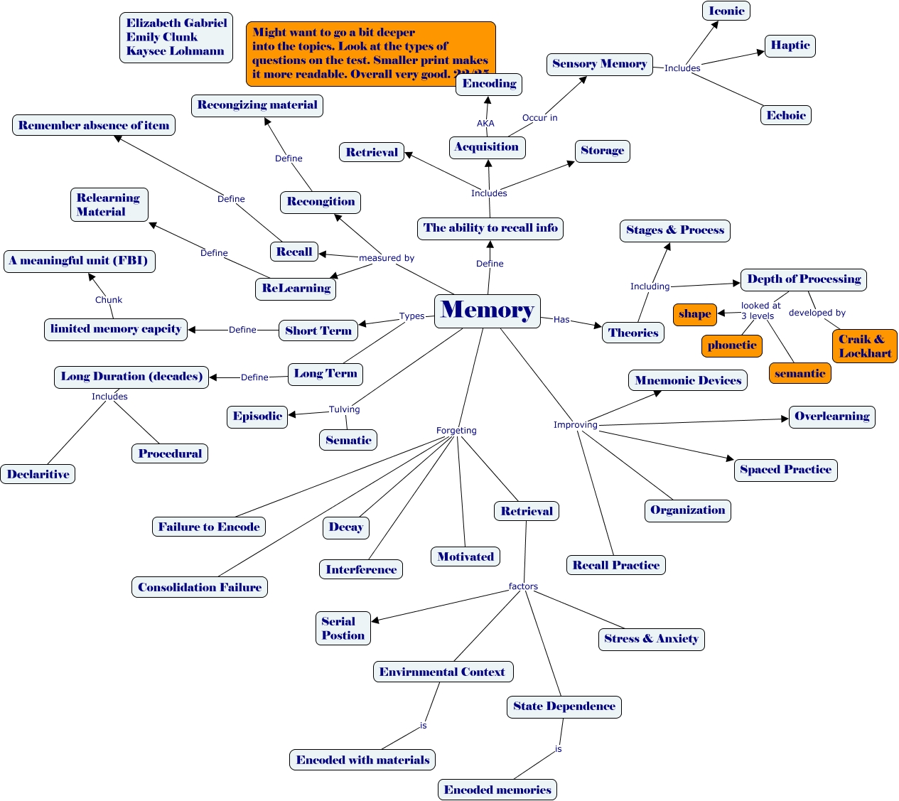 This Concept Map, created with IHMC CmapTools, has information related to: Memory chapter 6 , Emily Clunk 22, Acquisition AKA Encoding, Memory Forgeting Motivated, Sensory Memory Includes Echoic, The ability to recall info Includes Acquisition, Memory Types Long Term, Sensory Memory Includes Iconic, Memory Forgeting Retrieval, Memory Forgeting Interference, Long Duration (decades) Includes Procedural, The ability to recall info Includes Retrieval, Memory Forgeting Decay, Theories Including Stages & Process, Theories Including Depth of Processing, ReLearning Define Relearning Material, Depth of Processing looked at 3 levels shape, Long Duration (decades) Includes Declaritive, The ability to recall info Includes Storage, Memory Tulving Episodic, Depth of Processing developed by Craik & Lockhart, State Dependence is Encoded memories