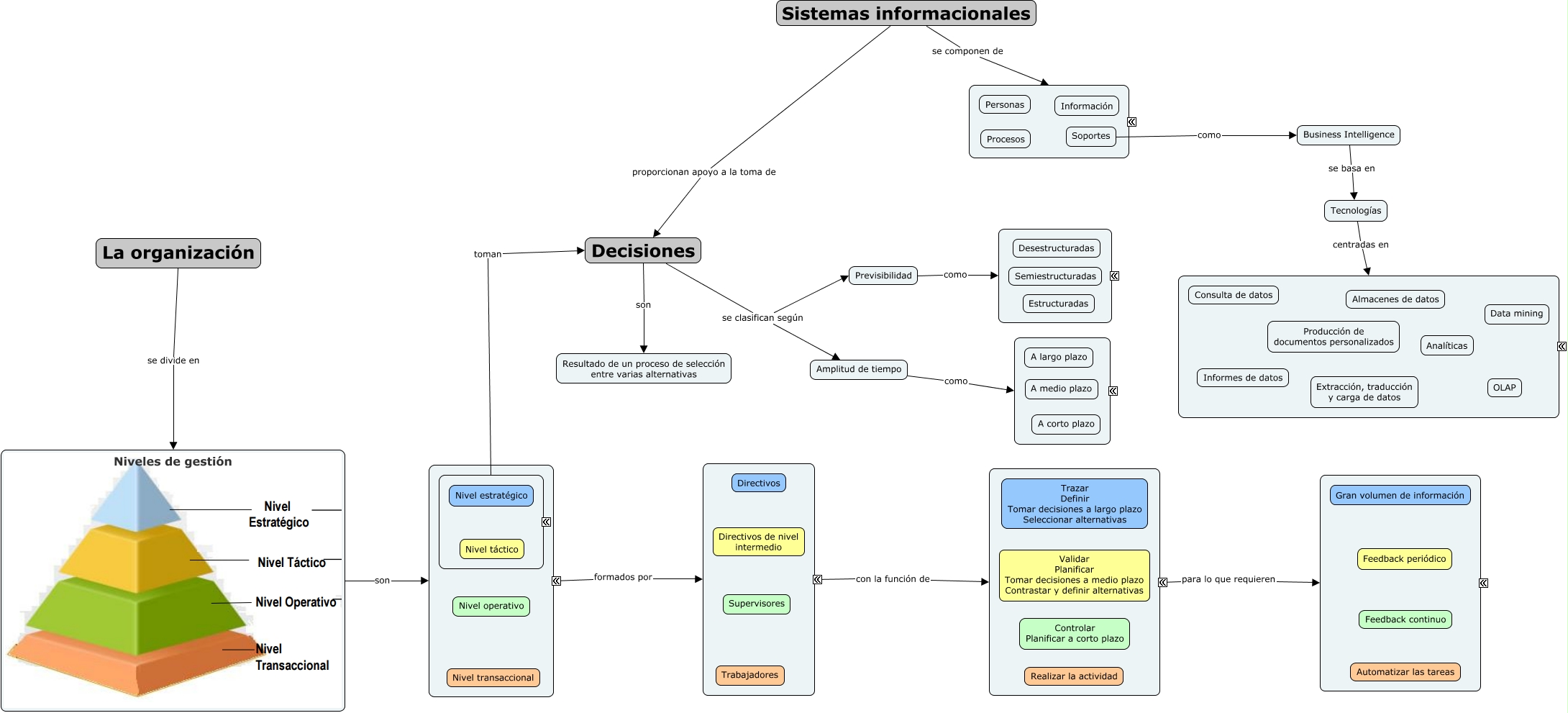 Este Cmap, tiene información relacionada con: sistemas informacionales, ???? formados por ????, ???? para lo que requieren ????, Tecnologías centradas en ????, La organización se divide en Niveles de gestión, Decisiones son Resultado de un proceso de selección entre varias alternativas, Soportes como Business Intelligence, Previsibilidad como ????, ???? toman Decisiones, Decisiones se clasifican según Previsibilidad, ???? con la función de ????, Niveles de gestión son ????, Sistemas informacionales proporcionan apoyo a la toma de Decisiones, Business Intelligence se basa en Tecnologías, Decisiones se clasifican según Amplitud de tiempo, Amplitud de tiempo como ????, Sistemas informacionales se componen de ????