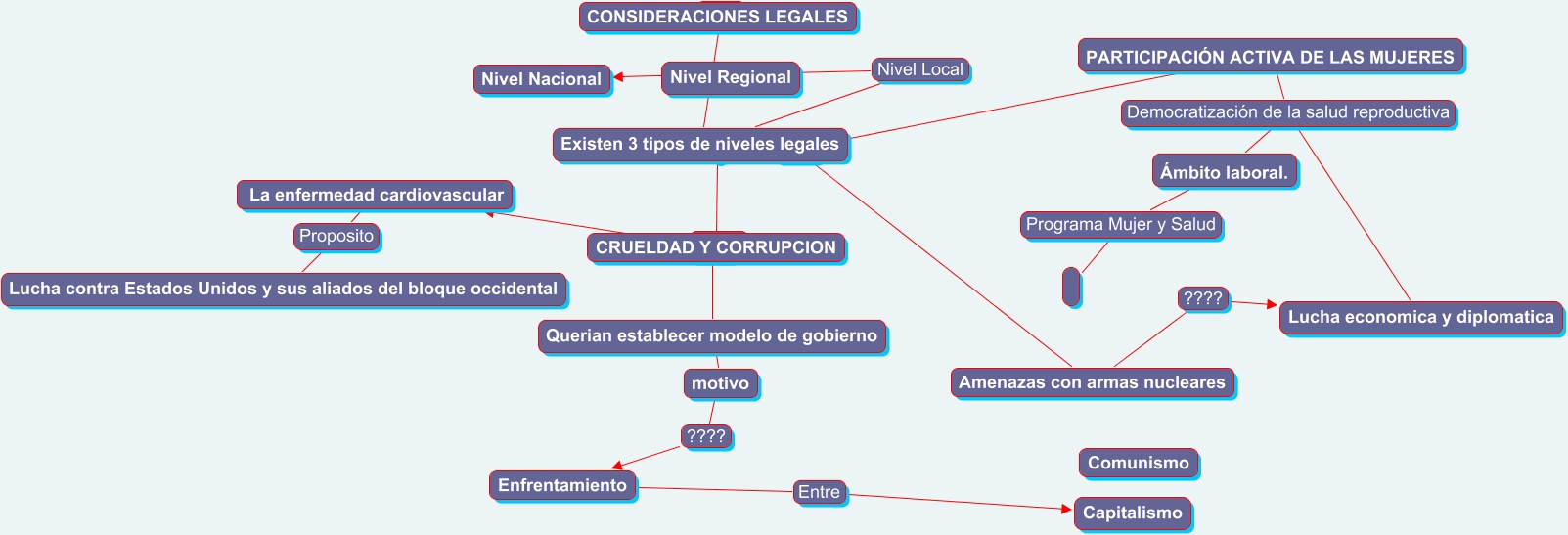 Este Cmap, tiene información relacionada con: LA GUERRA FRIA, PARTICIPACIÓN ACTIVA DE LAS MUJERES Democratización de la salud reproductiva Lucha economica y diplomatica, Querian establecer modelo de gobierno ???? motivo, CONSIDERACIONES LEGALES ???? Existen 3 tipos de niveles legales, Amenazas con armas nucleares ???? Lucha economica y diplomatica, CRUELDAD Y CORRUPCION ???? La enfermedad cardiovascular, Amenazas con armas nucleares ???? Existen 3 tipos de niveles legales, Existen 3 tipos de niveles legales Nivel Local Nivel Nacional, Enfrentamiento Entre Capitalismo, Ámbito laboral. Programa Mujer y Salud, CRUELDAD Y CORRUPCION ???? Querian establecer modelo de gobierno, CRUELDAD Y CORRUPCION ???? ????, Existen 3 tipos de niveles legales CRUELDAD Y CORRUPCION, PARTICIPACIÓN ACTIVA DE LAS MUJERES ???? Existen 3 tipos de niveles legales, PARTICIPACIÓN ACTIVA DE LAS MUJERES Democratización de la salud reproductiva Ámbito laboral., La enfermedad cardiovascular Proposito Lucha contra Estados Unidos y sus aliados del bloque occidental, motivo ???? Enfrentamiento