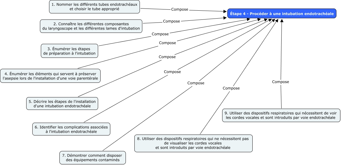 Cette carte de concepts créée avec IHMC CmapTools traite de: L'intubation endotrachéale, 6. Identifier les complications associées à l'intubation endotrachéale Compose Étape 4 - Procéder à une intubation endotrachéale, 7. Démontrer comment disposer des équipements contaminés Compose Étape 4 - Procéder à une intubation endotrachéale, 1. Nommer les différents tubes endotrachéaux et choisir le tube approprié Compose Étape 4 - Procéder à une intubation endotrachéale, 2. Connaître les différentes composantes du laryngoscope et les différentes lames d'intubation Compose Étape 4 - Procéder à une intubation endotrachéale, 8. Utiliser des dispositifs respiratoires qui ne nécessitent pas de visualiser les cordes vocales et sont introduits par voie endotrachéale Compose Étape 4 - Procéder à une intubation endotrachéale, 9. Utiliser des dispositifs respiratoires qui nécessitent de voir les cordes vocales et sont introduits par voie endotrachéale Compose Étape 4 - Procéder à une intubation endotrachéale, 3. Énumérer les étapes de préparation à l'intubation Compose Étape 4 - Procéder à une intubation endotrachéale, 4. Énumérer les éléments qui servent à préserver l'asepsie lors de l'installation d'une voie parentérale Compose Étape 4 - Procéder à une intubation endotrachéale, 5. Décrire les étapes de l'installation d'une intubation endotrachéale Compose Étape 4 - Procéder à une intubation endotrachéale