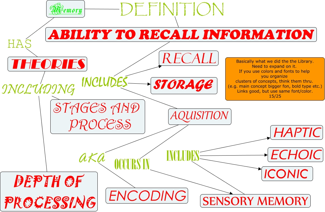 This Concept Map, created with IHMC CmapTools, has information related to: CHAP 6 SEAN CONREY 15, AQUISITION OCCURS IN SENSORY MEMORY, ABILITY TO RECALL INFORMATION INCLUDES RECALL, AQUISITION AKA ENCODING, THEORIES INCLUDING STAGES AND PROCESS, SENSORY MEMORY INCLUDES HAPTIC, SENSORY MEMORY INCLUDES ICONIC, ABILITY TO RECALL INFORMATION INCLUDES AQUISITION, ABILITY TO RECALL INFORMATION INCLUDES STORAGE, Memory HAS THEORIES, THEORIES INCLUDING DEPTH OF PROCESSING, Memory DEFINITION ABILITY TO RECALL INFORMATION, SENSORY MEMORY INCLUDES ECHOIC