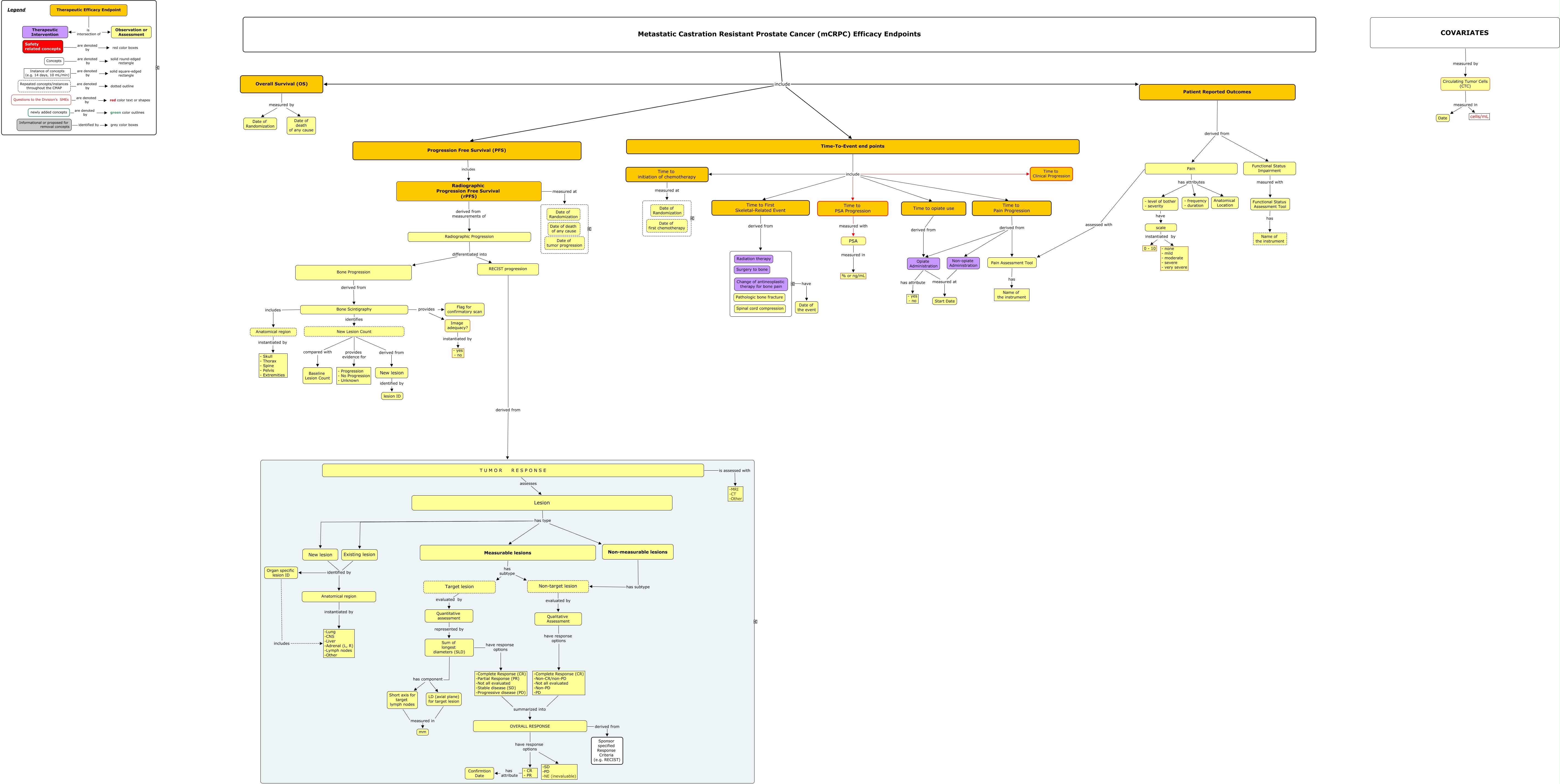 This Concept Map, created with IHMC CmapTools, has information related to: Prostate Cancer Efficacy Endpoints_v6, Anatomical region instantiated by -Lung -CNS -Liver -Adrenal (L, R) -Lymph nodes -Other, Bone Scintigraphy provides Image adequacy?, Non-opiate Administration measured at Start Date, Target lesion evaluated by Quantitative assessment, - CR - PR has attribute Confirmtion Date, Time-To-Event end points include Time to initiation of chemotherapy, Sum of longest diameters (SLD) has component LD (axial plane) for target lesion, Functional Status Impairment masured with Functional Status Assessment Tool, OVERALL RESPONSE derived from Sponsor specified Response Criteria (e.g. RECIST), T U M O R R E S P O N S E is assessed with -MRI -CT -Other, -Complete Response (CR) -Non-CR/non-PD -Not all evaluated -Non-PD -PD summarized into OVERALL RESPONSE, Progression Free Survival (PFS) includes Radiographic Progression Free Survival (rPFS), OVERALL RESPONSE have response options -SD -PD -NE (inevaluable), New lesion identified by Organ specific lesion ID, Non-target lesion evaluated by Qualitative Assessment, Circulating Tumor Cells (CTC) measured in Date, -Complete Response (CR) -Partial Response (PR) -Not all evaluated -Stable disease (SD) -Progressive disease (PD) summarized into OVERALL RESPONSE, Patient Reported Outcomes derived from Functional Status Impairment, LD (axial plane) for target lesion measured in mm, Sum of longest diameters (SLD) has component Short axis for target lymph nodes