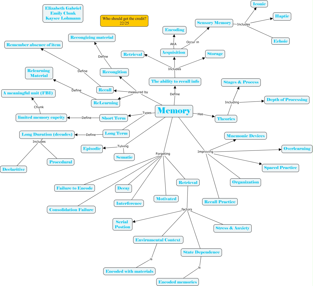 This Concept Map, created with IHMC CmapTools, has information related to: Emily Clunk-Gabriel-Lohman, Recongition Define Recongizing material, Memory Improving Spaced Practice, Memory Forgeting Consolidation Failure, Memory Improving Recall Practice, limited memory capcity Chunk A meaningful unit (FBI), Long Term Define Long Duration (decades), Memory Types Long Term, Sensory Memory Includes Echoic, The ability to recall info Includes Retrieval, Acquisition Occur in Sensory Memory, Memory Define The ability to recall info, Memory Improving Mnemonic Devices, Memory Tulving Episodic, Sensory Memory Includes Haptic, Memory Forgeting Motivated, Memory Tulving Sematic, Retrieval factors Stress & Anxiety, Retrieval factors State Dependence, State Dependence is Encoded memories, Memory measured by ReLearning