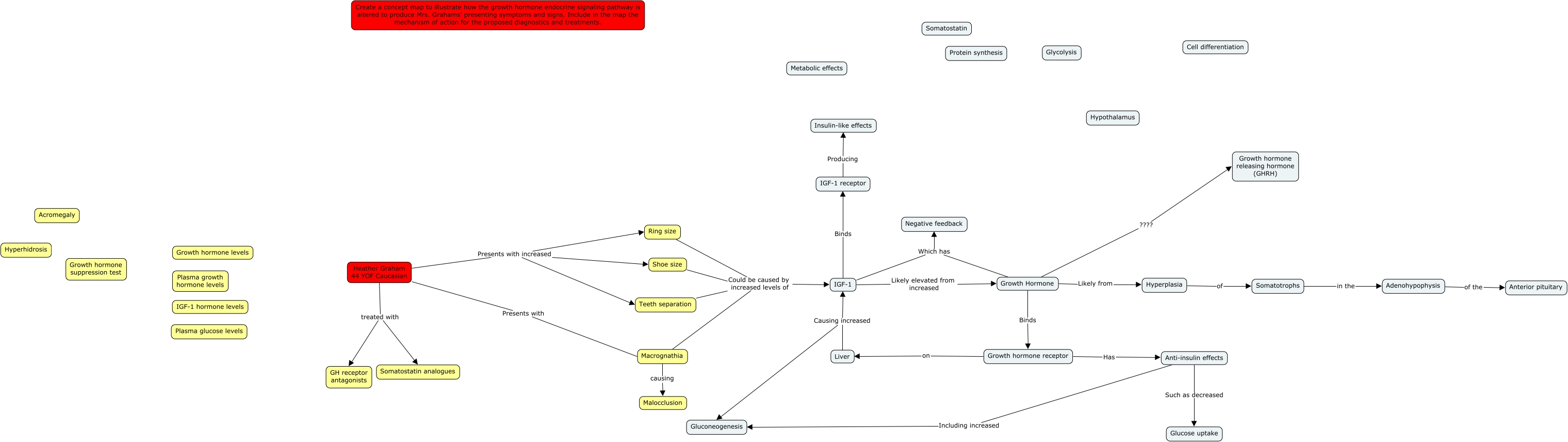 This Concept Map, created with IHMC CmapTools, has information related to: week 36b, Heather Graham 44 YOF Caucasian treated with GH receptor antagonists, Heather Graham 44 YOF Caucasian treated with Somatostatin analogues, Growth hormone receptor Has Anti-insulin effects, Liver Causing increased Gluconeogenesis, Anti-insulin effects Such as decreased Glucose uptake, IGF-1 Likely elevated from increased Growth Hormone, IGF-1 receptor Producing Insulin-like effects, Growth hormone receptor on Liver, Macrognathia causing Malocclusion, Heather Graham 44 YOF Caucasian Presents with increased Shoe size, Heather Graham 44 YOF Caucasian Presents with increased Teeth separation, Teeth separation Could be caused by increased levels of IGF-1, Growth Hormone Which has Negative feedback, Heather Graham 44 YOF Caucasian Presents with Macrognathia, Growth Hormone Binds Growth hormone receptor, Heather Graham 44 YOF Caucasian Presents with increased Ring size, Shoe size Could be caused by increased levels of IGF-1, Hyperplasia of Somatotrophs, Adenohypophysis of the Anterior pituitary, IGF-1 Binds IGF-1 receptor