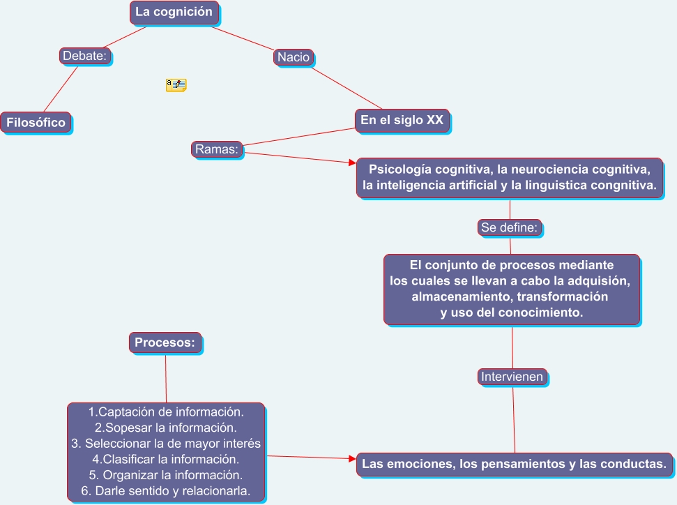 Este Cmap, tiene información relacionada con: Albert Einstein, La cognición Debate: Filosófico, La cognición Nacio En el siglo XX, Procesos: 1.Captación de información. 2.Sopesar la información. 3. Seleccionar la de mayor interés 4.Clasificar la información. 5. Organizar la información. 6. Darle sentido y relacionarla. Las emociones, los pensamientos y las conductas., Psicología cognitiva, la neurociencia cognitiva, la inteligencia artificial y la linguistica congnitiva. Se define: El conjunto de procesos mediante los cuales se llevan a cabo la adquisión, almacenamiento, transformación y uso del conocimiento., El conjunto de procesos mediante los cuales se llevan a cabo la adquisión, almacenamiento, transformación y uso del conocimiento. Intervienen Las emociones, los pensamientos y las conductas., En el siglo XX Ramas: Psicología cognitiva, la neurociencia cognitiva, la inteligencia artificial y la linguistica congnitiva.