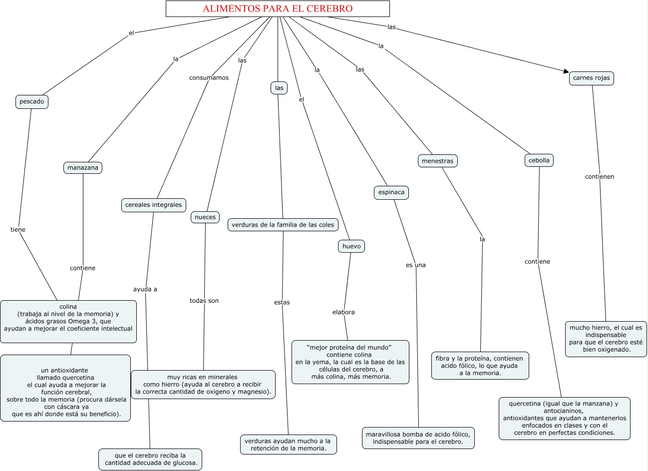 Este Cmap, tiene información relacionada con: alimentos para el cerebro, nueces todas son muy ricas en minerales como hierro (ayuda al cerebro a recibir la correcta cantidad de oxigeno y magnesio)., carnes rojas contienen mucho hierro, el cual es indispensable para que el cerebro esté bien oxigenado., ALIMENTOS PARA EL CEREBRO consumamos cereales integrales, verduras de la familia de las coles estas verduras ayudan mucho a la retención de la memoria., cebolla contiene quercetina (igual que la manzana) y antocianinos, antioxidantes que ayudan a mantenerlos enfocados en clases y con el cerebro en perfectas condiciones., ALIMENTOS PARA EL CEREBRO el pescado, ALIMENTOS PARA EL CEREBRO las carnes rojas, ALIMENTOS PARA EL CEREBRO las menestras, ALIMENTOS PARA EL CEREBRO las nueces, ALIMENTOS PARA EL CEREBRO la cebolla, pescado tiene colina (trabaja al nivel de la memoria) y ácidos grasos Omega 3, que ayudan a mejorar el coeficiente intelectual, ALIMENTOS PARA EL CEREBRO verduras de la familia de las coles, espinaca es una maravillosa bomba de acido fólico, indispensable para el cerebro., cereales integrales ayuda a que el cerebro reciba la cantidad adecuada de glucosa., ALIMENTOS PARA EL CEREBRO la manazana, ALIMENTOS PARA EL CEREBRO el huevo, ALIMENTOS PARA EL CEREBRO la espinaca, menestras la fibra y la proteína, contienen acido fólico, lo que ayuda a la memoria., huevo elabora “mejor proteína del mundo” contiene colina en la yema, la cual es la base de las células del cerebro, a más colina, más memoria., manazana contiene un antioxidante llamado quercetina el cual ayuda a mejorar la función cerebral, sobre todo la memoria (procura dársela con cáscara ya que es ahí donde está su beneficio).