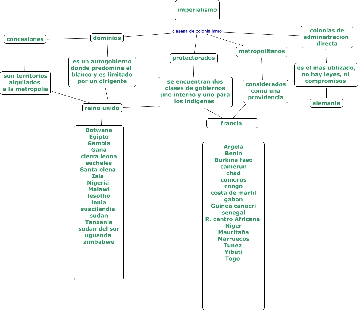 Este Cmap, tiene información relacionada con: map imperialismo, imperialismo clasesa de colonialismo protectorados, es un autogobierno donde predomina el blanco y es limitado por un dirigente ???? reino unido, es el mas utilizado, no hay leyes, ni compromisos ???? alemania, se encuentran dos clases de gobiernos uno interno y uno para los indigenas ???? reino unido, son territorios alquilados a la metropolis ???? reino unido, considerados como una providencia ???? francia, imperialismo clasesa de colonialismo metropolitanos, se encuentran dos clases de gobiernos uno interno y uno para los indigenas ???? francia, imperialismo clasesa de colonialismo dominios, protectorados ???? se encuentran dos clases de gobiernos uno interno y uno para los indigenas, francia ???? Argela Benin Burkina faso camerun chad comoros congo costa de marfil gabon Guinea canocri senegal R. centro Africana Niger Mauritaña Marruecos Tunez Yibuti Togo, reino unido ???? Botwana Egipto Gambia Gana cierra leona secheles Santa elena Isla Nigeria Malawi lesotho lenia suacilandia sudan Tanzania sudan del sur uguanda zimbabwe, dominios ???? concesiones, colonias de administracion directa ???? es el mas utilizado, no hay leyes, ni compromisos, imperialismo clasesa de colonialismo colonias de administracion directa, concesiones ???? ????, metropolitanos ???? ????, es un autogobierno donde predomina el blanco y es limitado por un dirigente ???? dominios