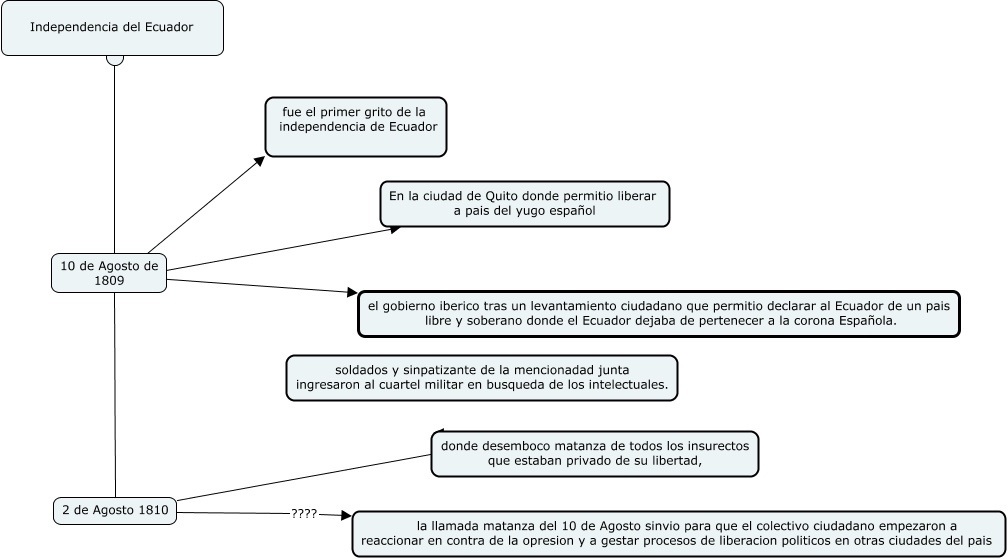 Esse mapa conceitual, produzido no IHMC CmapTools, tem a informação relacionada a: MARA SOFWARE, fue el primer grito de la independencia de Ecuador, En la ciudad de Quito donde permitio liberar a pais del yugo español, 2 de Agosto 1810, 10 de Agosto de 1809 ???? el gobierno iberico tras un levantamiento ciudadano que permitio declarar al Ecuador de un pais libre y soberano donde el Ecuador dejaba de pertenecer a la corona Española., 2 de Agosto 1810 ???? la llamada matanza del 10 de Agosto sinvio para que el colectivo ciudadano empezaron a reaccionar en contra de la opresion y a gestar procesos de liberacion politicos en otras ciudades del pais, 2 de Agosto 1810 ???? donde desemboco matanza de todos los insurectos que estaban privado de su libertad,