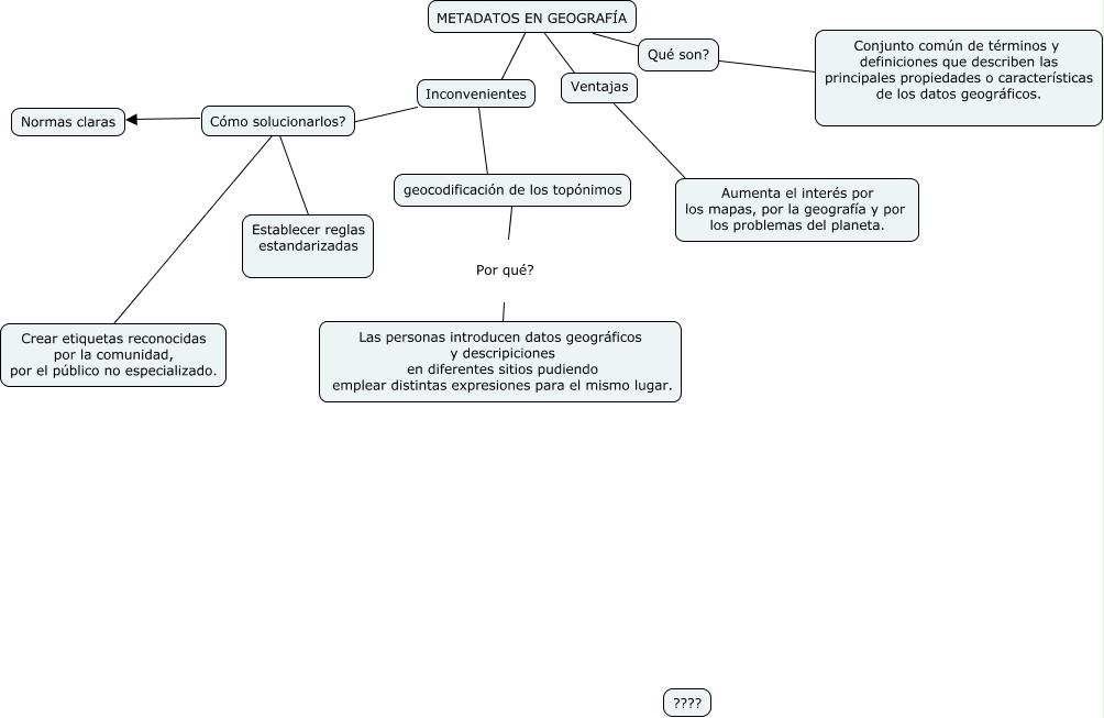 Este Cmap, tiene información relacionada con: Metadatos, geocodificación de los topónimos Por qué? Las personas introducen datos geográficos y descripiciones en diferentes sitios pudiendo emplear distintas expresiones para el mismo lugar., Cómo solucionarlos? ???? Normas claras, Cómo solucionarlos? ???? Crear etiquetas reconocidas por la comunidad, por el público no especializado., Inconvenientes ???? geocodificación de los topónimos, METADATOS EN GEOGRAFÍA ???? Qué son?, Cómo solucionarlos? ???? Establecer reglas estandarizadas, Qué son? ???? Conjunto común de términos y definiciones que describen las principales propiedades o características de los datos geográficos., Ventajas ???? Aumenta el interés por los mapas, por la geografía y por los problemas del planeta., METADATOS EN GEOGRAFÍA ???? Inconvenientes, Inconvenientes ???? Cómo solucionarlos?, METADATOS EN GEOGRAFÍA ???? Ventajas
