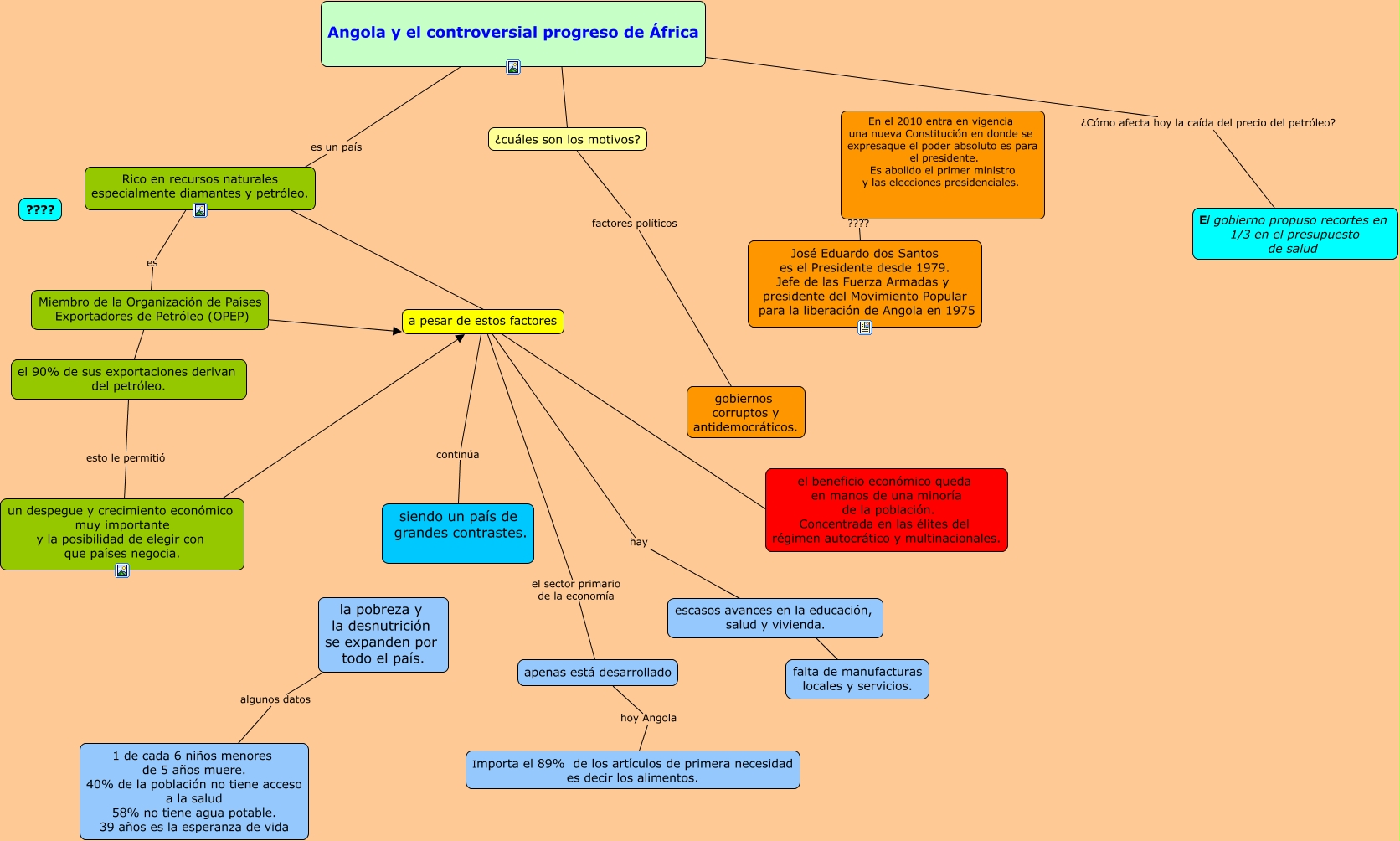 Este Cmap, tiene información relacionada con: Angola, José Eduardo dos Santos es el Presidente desde 1979. Jefe de las Fuerza Armadas y presidente del Movimiento Popular para la liberación de Angola en 1975 ???? En el 2010 entra en vigencia una nueva Constitución en donde se expresaque el poder absoluto es para el presidente. Es abolido el primer ministro y las elecciones presidenciales., Angola y el controversial progreso de África ???? ¿cuáles son los motivos?, Rico en recursos naturales especialmente diamantes y petróleo. es Miembro de la Organización de Países Exportadores de Petróleo (OPEP), Angola y el controversial progreso de África ¿Cómo afecta hoy la caída del precio del petróleo? El gobierno propuso recortes en 1/3 en el presupuesto de salud, apenas está desarrollado hoy Angola Importa el 89% de los artículos de primera necesidad es decir los alimentos., Rico en recursos naturales especialmente diamantes y petróleo. ???? a pesar de estos factores, el 90% de sus exportaciones derivan del petróleo. esto le permitió un despegue y crecimiento económico muy importante y la posibilidad de elegir con que países negocia., Miembro de la Organización de Países Exportadores de Petróleo (OPEP) ???? el 90% de sus exportaciones derivan del petróleo., ¿cuáles son los motivos? factores políticos gobiernos corruptos y antidemocráticos., un despegue y crecimiento económico muy importante y la posibilidad de elegir con que países negocia. ???? a pesar de estos factores, a pesar de estos factores hay escasos avances en la educación, salud y vivienda., a pesar de estos factores continúa siendo un país de grandes contrastes., la pobreza y la desnutrición se expanden por todo el país. algunos datos 1 de cada 6 niños menores de 5 años muere. 40% de la población no tiene acceso a la salud 58% no tiene agua potable. 39 años es la esperanza de vida, a pesar de estos factores ???? el beneficio económico queda en manos de una minoría de la población. Concentrada en las élites del régimen autocrático y multinacionales., a pesar de estos factores el sector primario de la economía apenas está desarrollado, Miembro de la Organización de Países Exportadores de Petróleo (OPEP) ???? a pesar de estos factores, Angola y el controversial progreso de África es un país ????, escasos avances en la educación, salud y vivienda. ???? falta de manufacturas locales y servicios.
