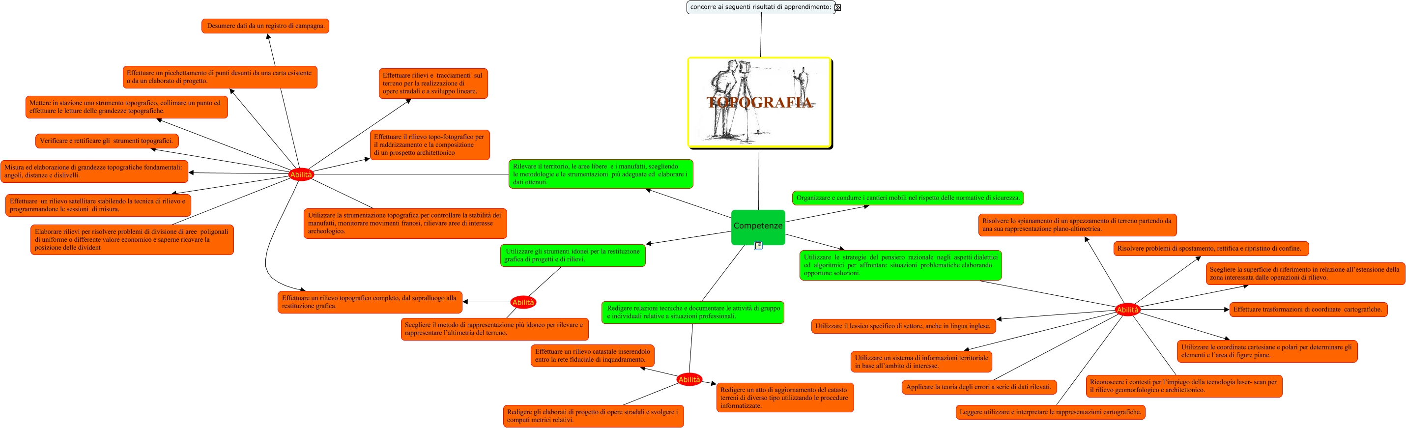 Questa Cmap, creata con IHMC CmapTools, contiene informazioni relative a: Presentazione Alessandro Rapisarda, TOPOGRAFIA Risultati di apprendimento Cogliere l’importanza dell’orientamento al risultato, del lavoro per obiettivi e della necessità di assumere responsabilità nel rispetto dell’etica e della deontologia professionale., Utilizzare le strategie del pensiero razionale negli aspetti dialettici ed algoritmici per affrontare situazioni problematiche elaborando opportune soluzioni. Abilità Utilizzare il lessico specifico di settore, anche in lingua inglese., Redigere relazioni tecniche e documentare le attività di gruppo e individuali relative a situazioni professionali. Abilità Redigere gli elaborati di progetto di opere stradali e svolgere i computi metrici relativi., Rilevare il territorio, le aree libere e i manufatti, scegliendo le metodologie e le strumentazioni più adeguate ed elaborare i dati ottenuti. Abilità Effettuare rilievi e tracciamenti sul terreno per la realizzazione di opere stradali e a sviluppo lineare., Rilevare il territorio, le aree libere e i manufatti, scegliendo le metodologie e le strumentazioni più adeguate ed elaborare i dati ottenuti. Abilità Effettuare un rilievo topografico completo, dal sopralluogo alla restituzione grafica., Utilizzare le strategie del pensiero razionale negli aspetti dialettici ed algoritmici per affrontare situazioni problematiche elaborando opportune soluzioni. Abilità Effettuare trasformazioni di coordinate cartografiche., Utilizzare le strategie del pensiero razionale negli aspetti dialettici ed algoritmici per affrontare situazioni problematiche elaborando opportune soluzioni. Abilità Risolvere lo spianamento di un appezzamento di terreno partendo da una sua rappresentazione plano-altimetrica., TOPOGRAFIA Risultati di apprendimento Riconoscere gli aspetti geografici, ecologici,territoriali, dell’ambiente naturale ed antropico, le connessioni con le strutture demografiche, economiche, sociali culturali e le trasformazioni intervenute nel tempo., Rilevare il territorio, le aree libere e i manufatti, scegliendo le metodologie e le strumentazioni più adeguate ed elaborare i dati ottenuti. Abilità Effettuare un rilievo satellitare stabilendo la tecnica di rilievo e programmandone le sessioni di misura., Rilevare il territorio, le aree libere e i manufatti, scegliendo le metodologie e le strumentazioni più adeguate ed elaborare i dati ottenuti. Abilità Mettere in stazione uno strumento topografico, collimare un punto ed effettuare le letture delle grandezze topografiche., TOPOGRAFIA Competenze Utilizzare le strategie del pensiero razionale negli aspetti dialettici ed algoritmici per affrontare situazioni problematiche elaborando opportune soluzioni., Utilizzare le strategie del pensiero razionale negli aspetti dialettici ed algoritmici per affrontare situazioni problematiche elaborando opportune soluzioni. Abilità Applicare la teoria degli errori a serie di dati rilevati., Utilizzare gli strumenti idonei per la restituzione grafica di progetti e di rilievi. Abilità Effettuare un rilievo topografico completo, dal sopralluogo alla restituzione grafica., TOPOGRAFIA Competenze Utilizzare gli strumenti idonei per la restituzione grafica di progetti e di rilievi., Rilevare il territorio, le aree libere e i manufatti, scegliendo le metodologie e le strumentazioni più adeguate ed elaborare i dati ottenuti. Abilità Misura ed elaborazione di grandezze topografiche fondamentali: angoli, distanze e dislivelli., Utilizzare le strategie del pensiero razionale negli aspetti dialettici ed algoritmici per affrontare situazioni problematiche elaborando opportune soluzioni. Abilità Utilizzare le coordinate cartesiane e polari per determinare gli elementi e l’area di figure piane., TOPOGRAFIA Risultati di apprendimento Utilizzare, in contesti di ricerca applicata, procedure e tecniche per trovare soluzioni innovative e migliorative, in relazione ai campi di propria competenza., Redigere relazioni tecniche e documentare le attività di gruppo e individuali relative a situazioni professionali. Abilità Effettuare un rilievo catastale inserendolo entro la rete fiduciale di inquadramento., Utilizzare gli strumenti idonei per la restituzione grafica di progetti e di rilievi. Abilità Scegliere il metodo di rappresentazione più idoneo per rilevare e rappresentare l’altimetria del terreno., Utilizzare le strategie del pensiero razionale negli aspetti dialettici ed algoritmici per affrontare situazioni problematiche elaborando opportune soluzioni. Abilità Riconoscere i contesti per l’impiego della tecnologia laser- scan per il rilievo geomorfologico e architettonico.