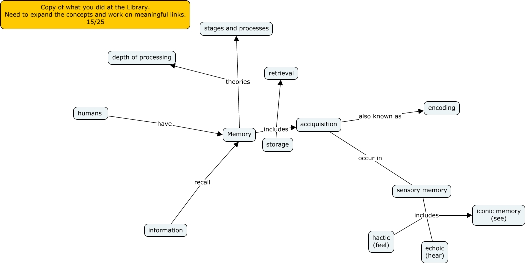 This Concept Map, created with IHMC CmapTools, has information related to: Chap 6 Dante Roberts - 15, Memory includes acciquisition, sensory memory includes iconic memory (see), humans have Memory, information recall Memory, Memory theories stages and processes, sensory memory includes echoic (hear), acciquisition occur in sensory memory, sensory memory includes hactic (feel), Memory theories depth of processing, acciquisition also known as encoding, Memory includes storage, Memory includes retrieval