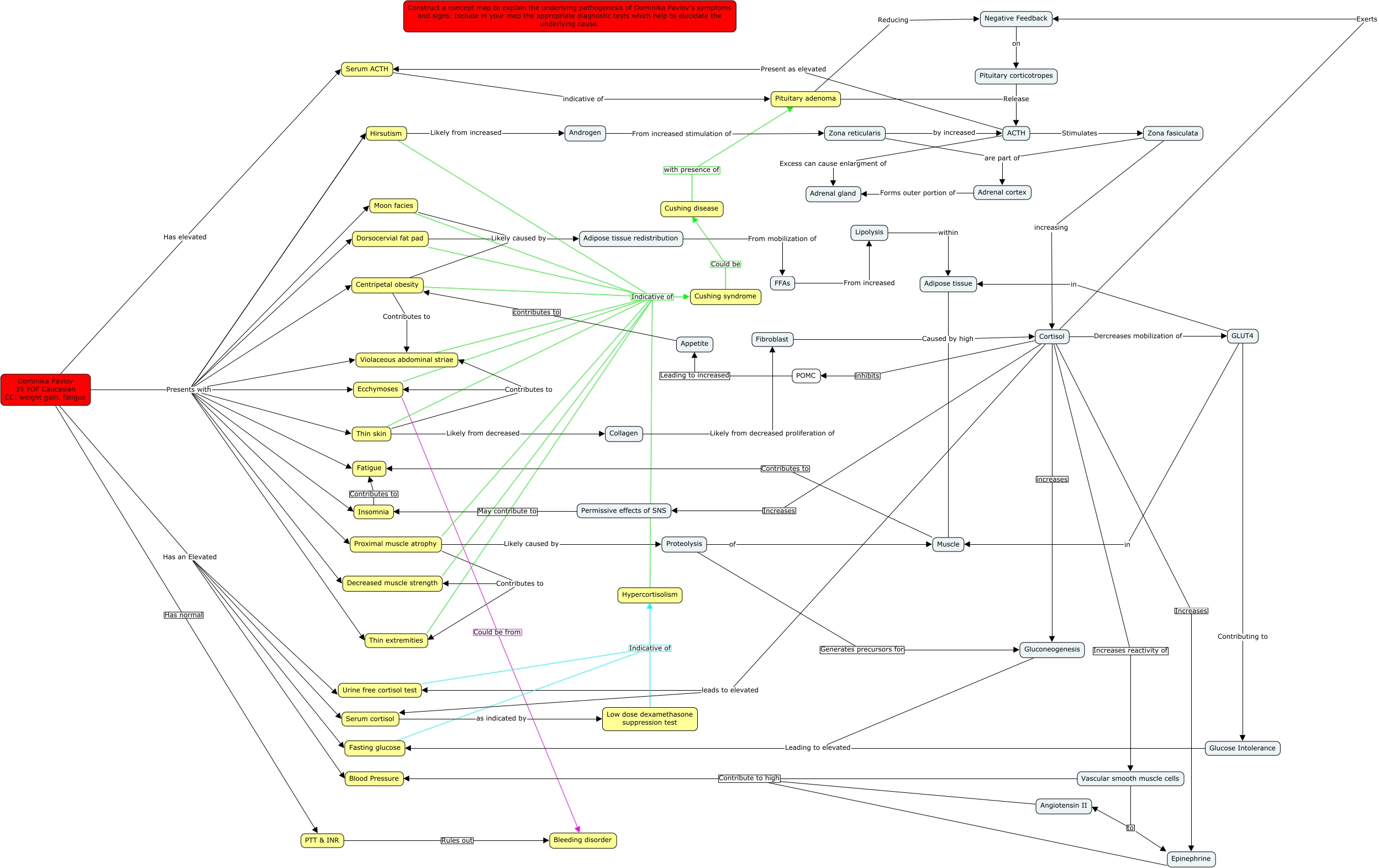 This Concept Map, created with IHMC CmapTools, has information related to: week 38 dominika pavlov, Proximal muscle atrophy Contributes to Decreased muscle strength, Zona reticularis by increased ACTH, PTT & INR Rules out Bleeding disorder, Vascular smooth muscle cells to Epinephrine, Cortisol leads to elevated Serum cortisol, Dominika Pavlov 35 YOF Caucasian CC: weight gain, fatigue Has an Elevated Urine free cortisol test, Negative Feedback on Pituitary corticotropes, Thin extremities Indicative of Cushing syndrome, Cortisol Exerts Negative Feedback, Dominika Pavlov 35 YOF Caucasian CC: weight gain, fatigue Presents with Hirsutism, Thin skin Likely from decreased Collagen, Moon facies Likely caused by Adipose tissue redistribution, Epinephrine Contribute to high Blood Pressure, Zona fasiculata increasing Cortisol, Proximal muscle atrophy Contributes to Thin extremities, Fibroblast Caused by high Cortisol, Muscle Contributes to Fatigue, FFAs From increased Lipolysis, GLUT4 in Adipose tissue, Dominika Pavlov 35 YOF Caucasian CC: weight gain, fatigue Presents with Hirsutism