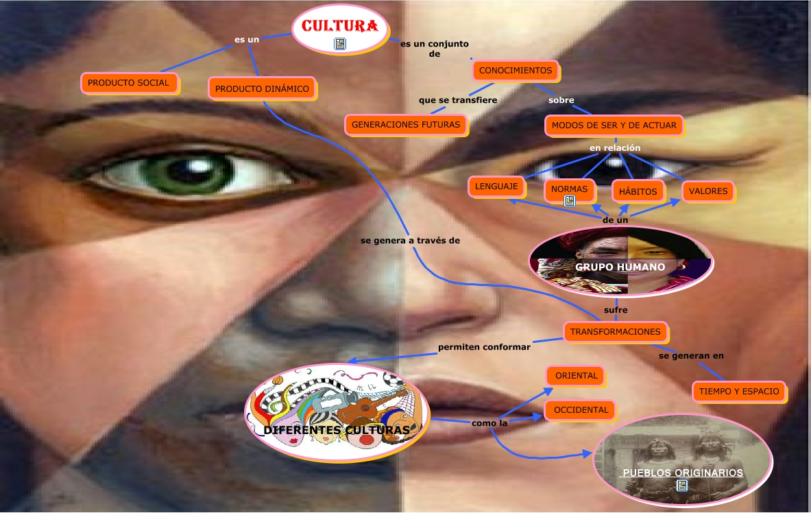 Este Cmap, tiene información relacionada con: CULTURA, CONOCIMIENTOS que se transfiere GENERACIONES FUTURAS, TRANSFORMACIONES se generan en TIEMPO Y ESPACIO, HÁBITOS de un GRUPO HUMANO, MODOS DE SER Y DE ACTUAR en relación HÁBITOS, GRUPO HUMANO sufre TRANSFORMACIONES, PRODUCTO DINÁMICO se genera a través de TRANSFORMACIONES, MODOS DE SER Y DE ACTUAR en relación LENGUAJE, HÁBITOS de un VALORES, DIFERENTES CULTURAS como la PUEBLOS ORIGINARIOS, CULTURA es un PRODUCTO SOCIAL, CONOCIMIENTOS sobre MODOS DE SER Y DE ACTUAR, TRANSFORMACIONES permiten conformar DIFERENTES CULTURAS, MODOS DE SER Y DE ACTUAR en relación VALORES, CULTURA es un conjunto de CONOCIMIENTOS, HÁBITOS de un NORMAS, DIFERENTES CULTURAS como la ORIENTAL, CULTURA es un PRODUCTO DINÁMICO, DIFERENTES CULTURAS como la OCCIDENTAL, HÁBITOS de un LENGUAJE, MODOS DE SER Y DE ACTUAR en relación NORMAS