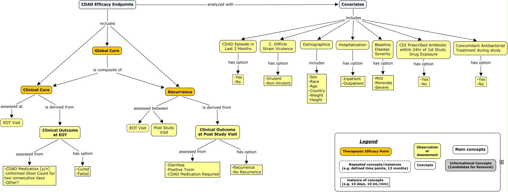 This Concept Map, created with IHMC CmapTools, has information related to: CDAD Efficacy Endpoints v1-1, Covariates includes C. Difficle Strain Virulence, Covariates includes Baseline Disease Severity, Baseline Disease Severity has option -Mild -Morerate -Severe, CDI Prescribed Antibiotic within 24hr of 1st Study Drug Exposure has option -Yes -No, Recurrence is derived from Clinical Outcome at Post Study Visit, Covariates includes Demographics, Clinical Cure assessed at EOT Visit, CDAD Efficacy Endpoints includes Global Cure, CDAD Efficacy Endpoints includes Recurrence, Clinical Outcome at EOT assessed from -CDAD Medication [y/n] -Unformed Stool Count for two consecutive days -Other?, CDAD Episode in Last 3 Months has option -Yes -No, Global Cure is composite of Clinical Cure, C. Difficle Strain Virulence has option -Virulent -Non-Virulent, Recurrence assessed between Post Study Visit, Hospitalization has option -Inpatient -Outpatient, Global Cure is composite of Recurrence, Clinical Outcome at Post Study Visit has option -Recurrence -No Recurrence, Clinical Outcome at EOT has option -Cured -Failed, CDAD Efficacy Endpoints analyzed with Covariates, Demographics includes -Sex -Race -Age -Country -Weight -Height