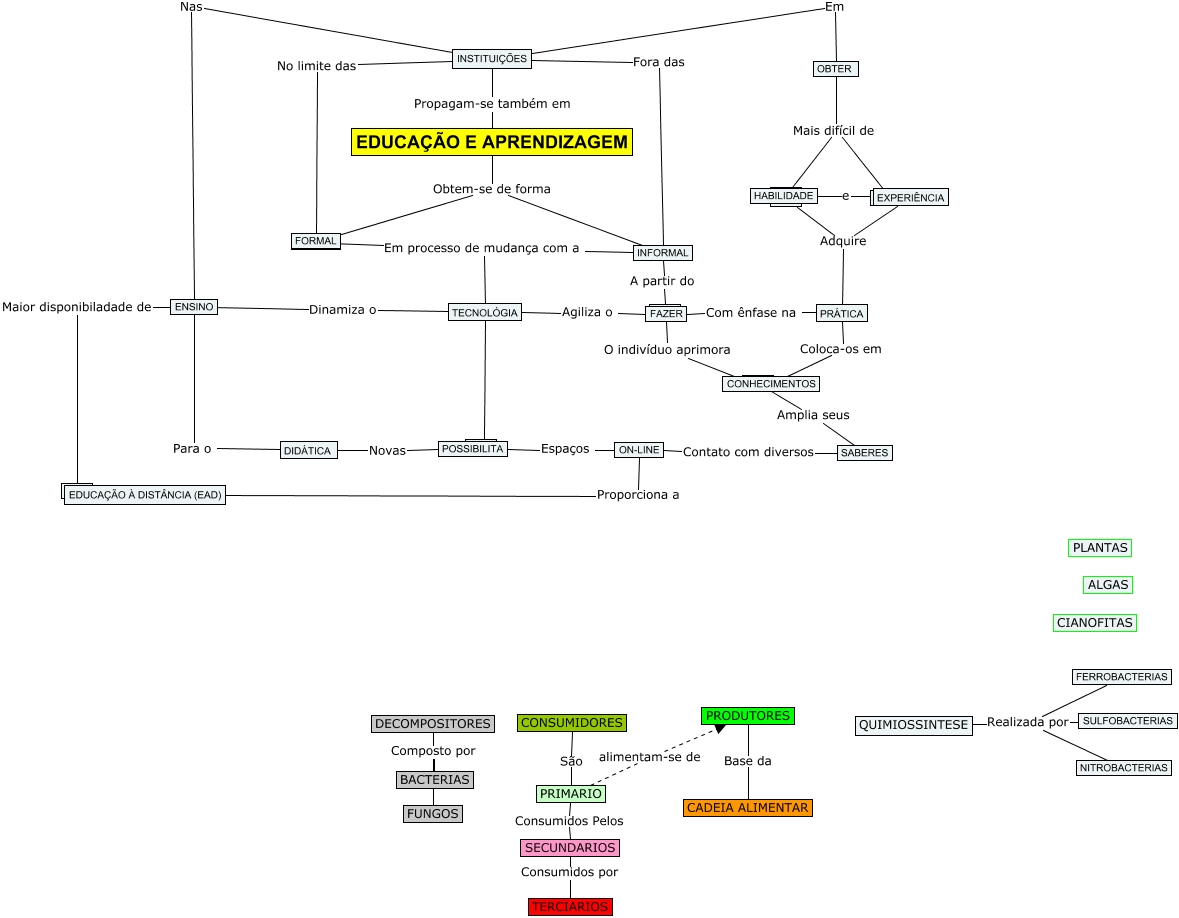 Esse mapa conceitual, produzido no IHMC CmapTools, tem a informação relacionada a: ECOSSISTEMA, QUIMIOSSINTESE Realizada por SULFOBACTERIAS, ???? ???? ????, TECNOLÓGIA Dinamiza o ????, PRIMARIO alimentam-se de PRODUTORES, ENSINO Maior disponibiladade de ????, INFORMAL Em processo de mudança com a TECNOLÓGIA, PRODUTORES Base da CADEIA ALIMENTAR, EXPERIÊNCIA Adquire ????, CONSUMIDORES São PRIMARIO, FAZER Com ênfase na ????, INFORMAL Em processo de mudança com a ????, SECUNDARIOS Consumidos por TERCIARIOS, INSTITUIÇÕES No limite das FORMAL, FERROBACTERIAS Realizada por NITROBACTERIAS, DIDÁTICA Novas POSSIBILITA, QUIMIOSSINTESE Realizada por NITROBACTERIAS, PRIMARIO Consumidos Pelos SECUNDARIOS, ENSINO Para o DIDÁTICA, ON-LINE Proporciona a EDUCAÇÃO À DISTÂNCIA (EAD), EXPERIÊNCIA Adquire PRÁTICA