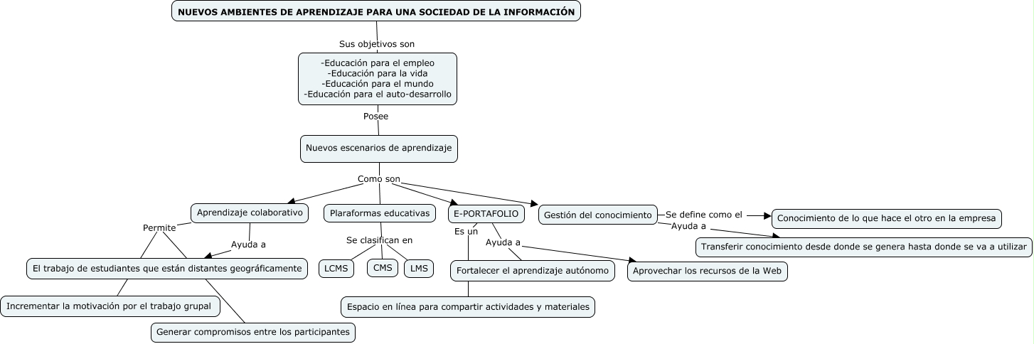 Este Cmap, tiene información relacionada con: NUEVOS AMBIENTES DE APRENDIZAJE, E-PORTAFOLIO Es un Espacio en línea para compartir actividades y materiales, Nuevos escenarios de aprendizaje Como son Plaraformas educativas, E-PORTAFOLIO Ayuda a Aprovechar los recursos de la Web, Aprendizaje colaborativo Permite Generar compromisos entre los participantes, Plaraformas educativas Se clasifican en LMS, -Educación para el empleo -Educación para la vida -Educación para el mundo -Educación para el auto-desarrollo Posee Nuevos escenarios de aprendizaje, Plaraformas educativas Se clasifican en LCMS, Nuevos escenarios de aprendizaje Como son Gestión del conocimiento, Aprendizaje colaborativo Permite Incrementar la motivación por el trabajo grupal, Gestión del conocimiento Se define como el Conocimiento de lo que hace el otro en la empresa, E-PORTAFOLIO Ayuda a Fortalecer el aprendizaje autónomo, Nuevos escenarios de aprendizaje Como son Aprendizaje colaborativo, Gestión del conocimiento Ayuda a Transferir conocimiento desde donde se genera hasta donde se va a utilizar, NUEVOS AMBIENTES DE APRENDIZAJE PARA UNA SOCIEDAD DE LA INFORMACIÓN Sus objetivos son -Educación para el empleo -Educación para la vida -Educación para el mundo -Educación para el auto-desarrollo, Plaraformas educativas Se clasifican en CMS, Aprendizaje colaborativo Ayuda a El trabajo de estudiantes que están distantes geográficamente, Nuevos escenarios de aprendizaje Como son E-PORTAFOLIO
