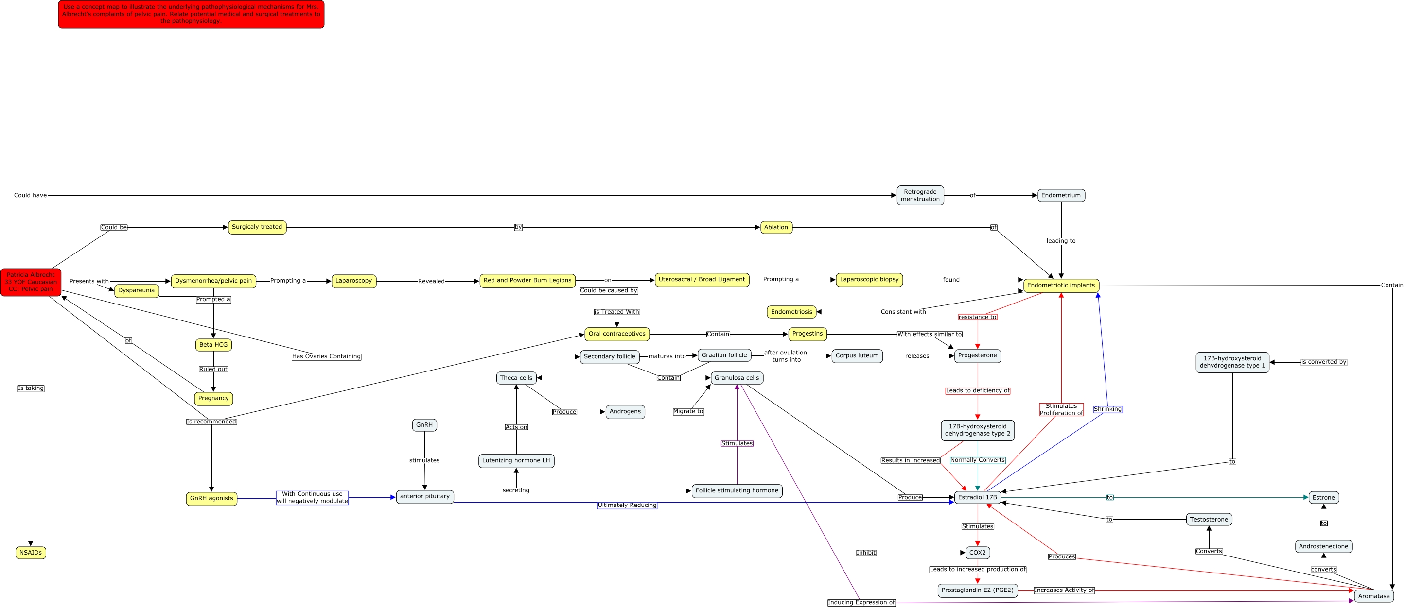 This Concept Map, created with IHMC CmapTools, has information related to: week 39 patricia albrecht, Dysmenorrhea/pelvic pain Prompted a Beta HCG, Prostaglandin E2 (PGE2) Increases Activity of Aromatase, Androstenedione to Estrone, Patricia Albrecht 33 YOF Caucasian CC: Pelvic pain Presents with Dyspareunia, Patricia Albrecht 33 YOF Caucasian CC: Pelvic pain Has Ovaries Containing Secondary follicle, Granulosa cells Inducing Expression of Aromatase, Follicle stimulating hormone Stimulates Granulosa cells, Dyspareunia Could be caused by Endometriotic implants, Uterosacral / Broad Ligament Prompting a Laparoscopic biopsy, Estrone is converted by 17B-hydroxysteroid dehydrogenase type 1, Laparoscopic biopsy found Endometriotic implants, NSAIDs Inhibit COX2, Lutenizing hormone LH Acts on Theca cells, Endometriotic implants Consistant with Endometriosis, Estradiol 17B to Estrone, Graafian follicle Contain Granulosa cells, COX2 Leads to increased production of Prostaglandin E2 (PGE2), Secondary follicle Contain Theca cells, Pregnancy of Patricia Albrecht 33 YOF Caucasian CC: Pelvic pain, Endometriotic implants Contain Aromatase