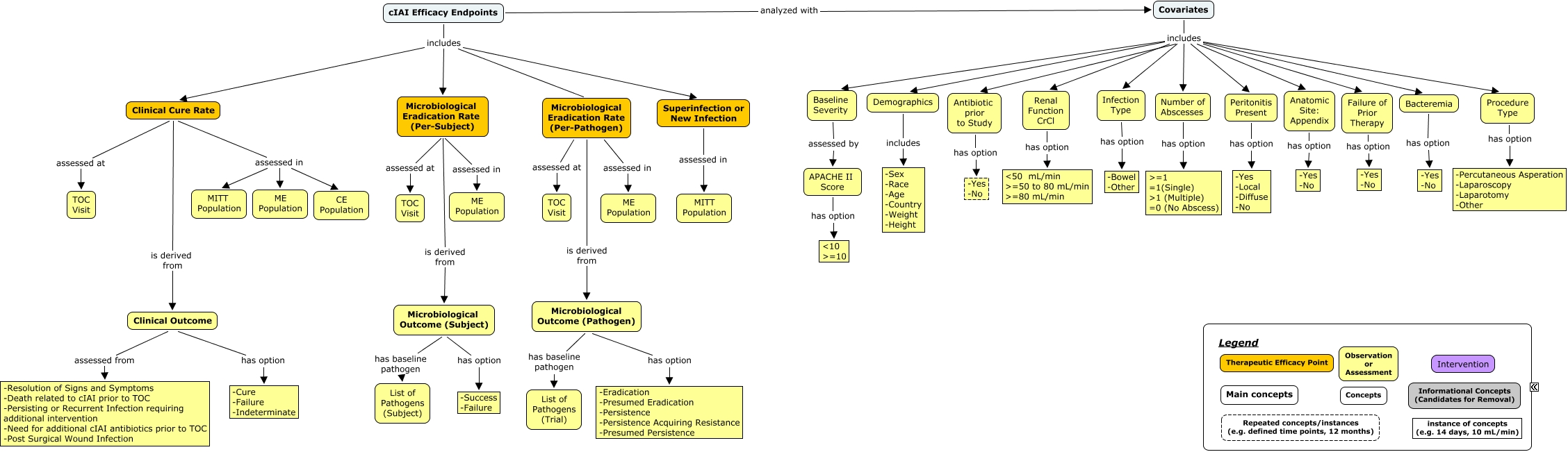 This Concept Map, created with IHMC CmapTools, has information related to: cIAI Efficacy Endpoints v1, Covariates includes Number of Abscesses, Clinical Cure Rate assessed in CE Population, Microbiological Outcome (Subject) has baseline pathogen List of Pathogens (Subject), APACHE II Score has option >=10, cIAI Efficacy Endpoints includes Microbiological Eradication Rate (Per-Pathogen), Microbiological Eradication Rate (Per-Subject) assessed in ME Population, Antibiotic prior to Study has option -Yes -No, Covariates includes Failure of Prior Therapy, Microbiological Eradication Rate (Per-Subject) assessed at TOC Visit, Peritonitis Present has option -Yes -Local -Diffuse -No, cIAI Efficacy Endpoints includes Superinfection or New Infection, Procedure Type has option -Percutaneous Asperation -Laparoscopy -Laparotomy -Other, Microbiological Eradication Rate (Per-Pathogen) assessed at TOC Visit, Clinical Cure Rate assessed at TOC Visit, Microbiological Eradication Rate (Per-Subject) is derived from Microbiological Outcome (Subject), Superinfection or New Infection assessed in MITT Population, Baseline Severity assessed by APACHE II Score, cIAI Efficacy Endpoints includes Microbiological Eradication Rate (Per-Subject), Microbiological Eradication Rate (Per-Pathogen) is derived from Microbiological Outcome (Pathogen), Clinical Cure Rate is derived from Clinical Outcome