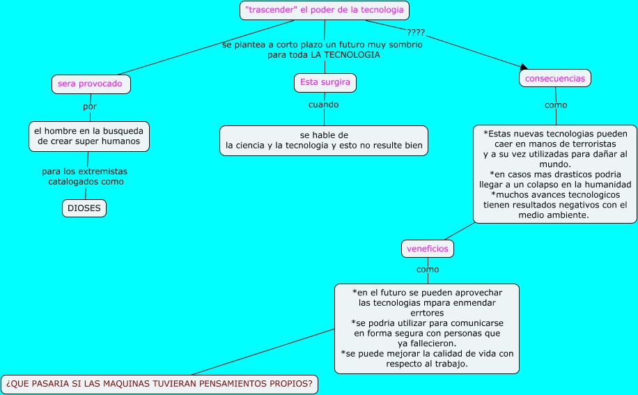 Este Cmap, tiene información relacionada con: KARENN VANESSA RODRIGUEZ, el hombre en la busqueda de crear super humanos para los extremistas catalogados como DIOSES, *Estas nuevas tecnologias pueden caer en manos de terroristas y a su vez utilizadas para dañar al mundo. *en casos mas drasticos podria llegar a un colapso en la humanidad *muchos avances tecnologicos tienen resultados negativos con el medio ambiente. ???? veneficios, veneficios como *en el futuro se pueden aprovechar las tecnologias mpara enmendar errtores *se podria utilizar para comunicarse en forma segura con personas que ya fallecieron. *se puede mejorar la calidad de vida con respecto al trabajo., "trascender" el poder de la tecnologia ???? consecuencias, "trascender" el poder de la tecnologia ???? sera provocado, sera provocado por el hombre en la busqueda de crear super humanos, "trascender" el poder de la tecnologia se plantea a corto plazo un futuro muy sombrio para toda LA TECNOLOGIA Esta surgira, ¿QUE PASARIA SI LAS MAQUINAS TUVIERAN PENSAMIENTOS PROPIOS? ???? *en el futuro se pueden aprovechar las tecnologias mpara enmendar errtores *se podria utilizar para comunicarse en forma segura con personas que ya fallecieron. *se puede mejorar la calidad de vida con respecto al trabajo., consecuencias como *Estas nuevas tecnologias pueden caer en manos de terroristas y a su vez utilizadas para dañar al mundo. *en casos mas drasticos podria llegar a un colapso en la humanidad *muchos avances tecnologicos tienen resultados negativos con el medio ambiente., Esta surgira cuando se hable de la ciencia y la tecnologia y esto no resulte bien